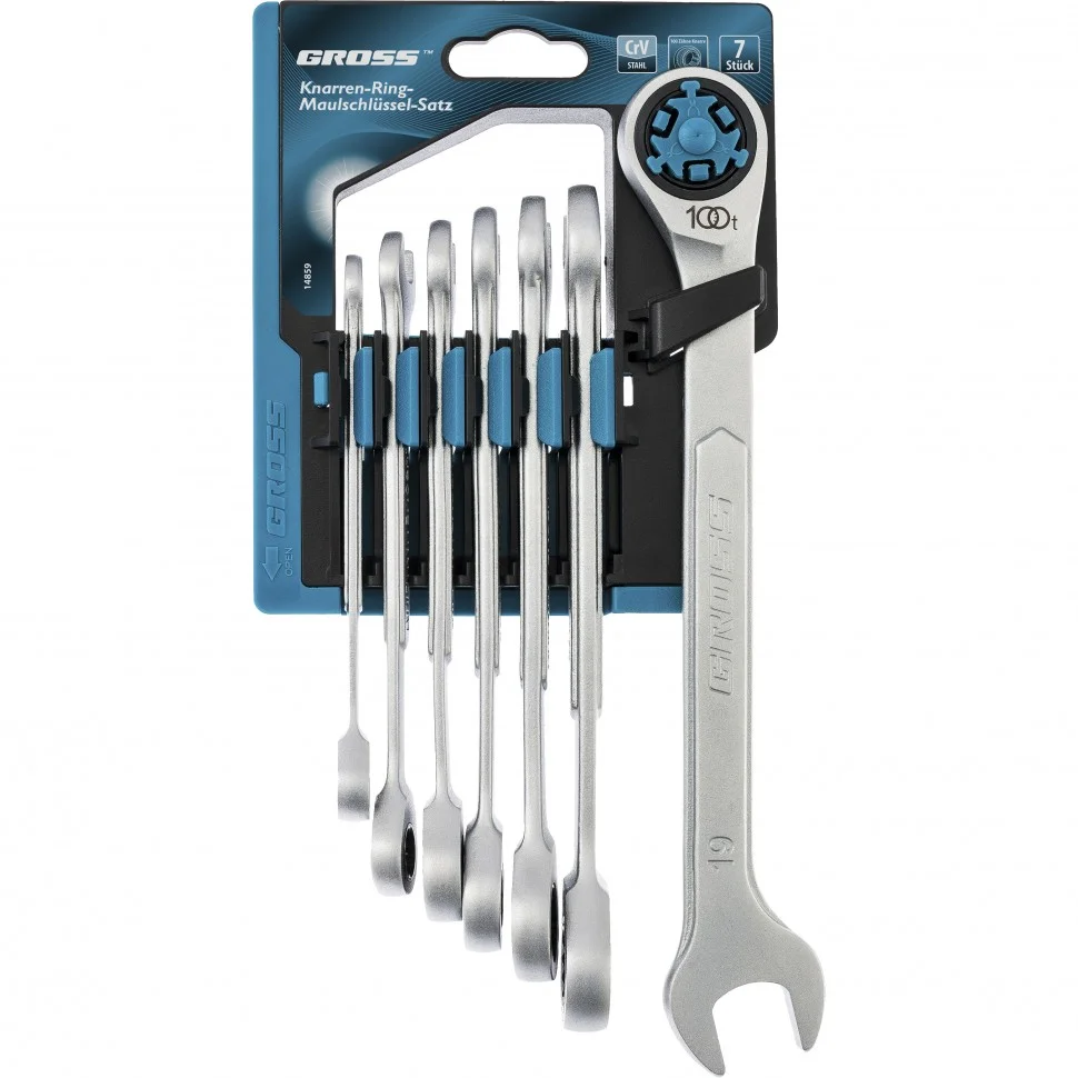 Набор ключей комбинированных трещоточных, количество зубьев 100, СRV, 7 шт, 8-19 мм Gross 14859