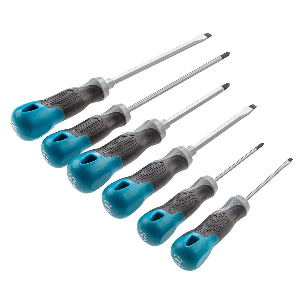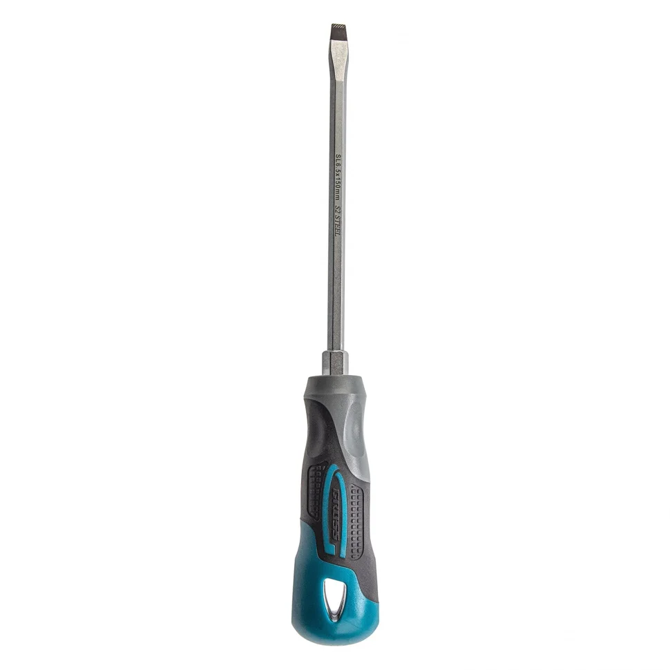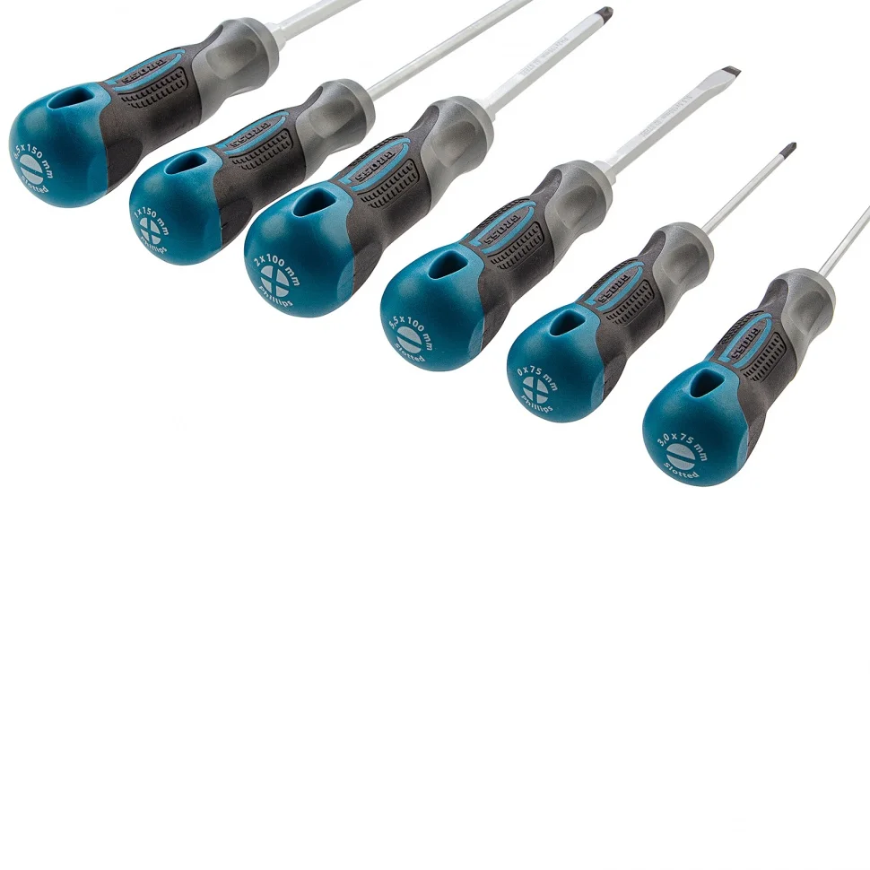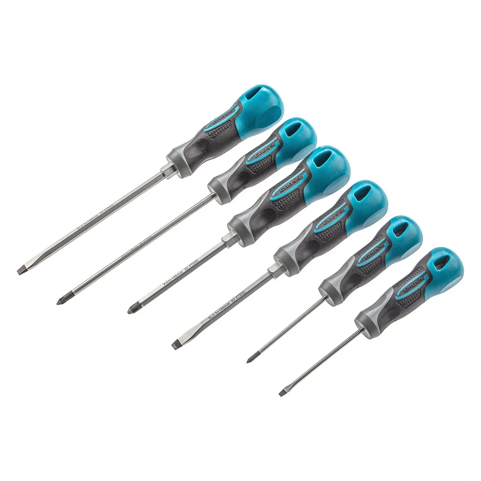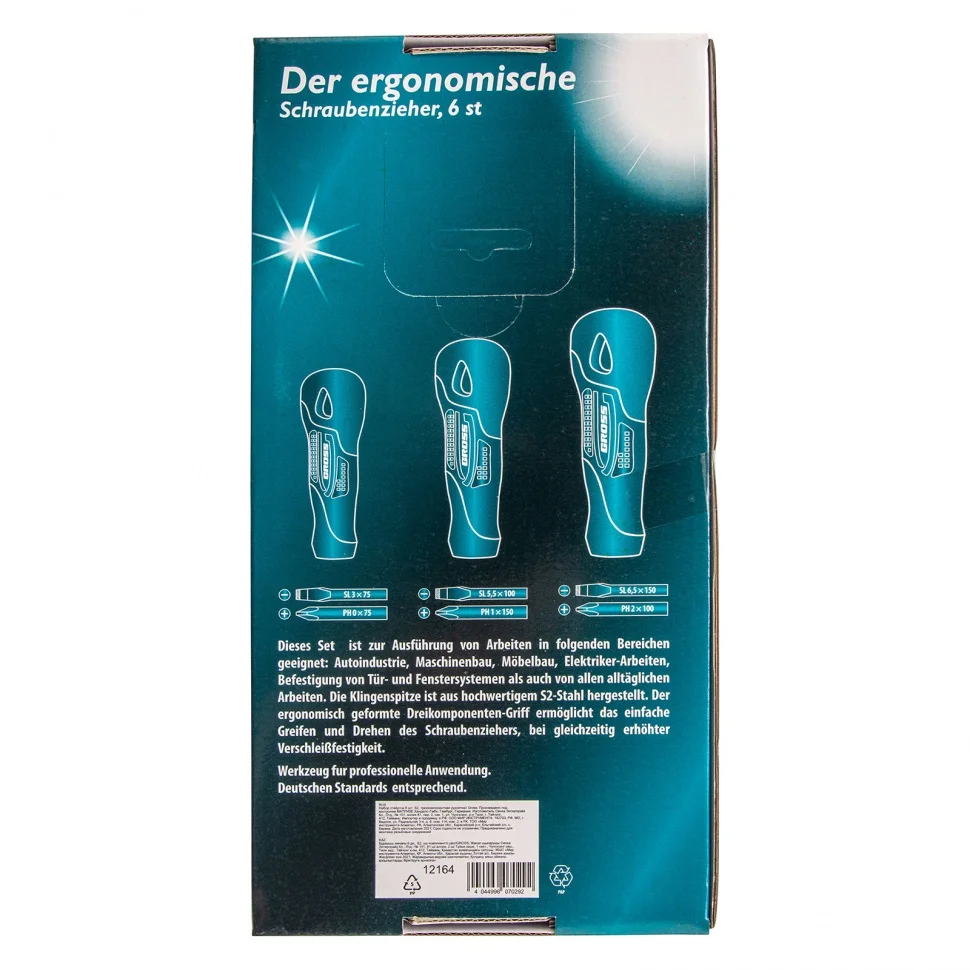 Набор из 6 отверток Gross 12164 из стали S2, с трехкомпонентными рукоятками, предназначен для монтажа и демонтажа крепежных элементов с профилем SL и PH. Высококачественные отвертки рассчитаны на повышенные нагрузки, поэтому подходят для бытового и профессионального использования. 6 отверток со стержнями длиной 75-150 мм позволяют работать с крепежом на поверхности и в углублениях.ПреимуществаДолговечность — отвертки изготовлены из высококачественной инструментальной стали S2.Высокий ресурс — благодаря индукционной закалке твердость рабочих частей составляет 56-58 HRC, что обеспечивает им устойчивость к износу.Удобство эксплуатации — специальные насечки и фосфатное покрытие шлицов обеспечивают улучшенное сцепление с крепежом, предотвращая его повреждение.Коррозионная стойкость — хромовое покрытие стержней отверток продлевает срок их службы.Намагниченные наконечники — крепежи надежно удерживаются на шлице отверток, поэтому их удобно направлять в отверстие.Широкие возможности — шестигранные выступы у основания рукояток позволяют использовать гаечный ключ на 10 мм для увеличения крутящего момента.Крупная и четкая маркировка — на затыльнике каждой рукоятки указан типоразмер шлица, что упрощает поиск нужной отвертки под конкретную задачу.Надежность и комфорт — трехкомпонентные рукоятки крепко соединены со стержнями и обеспечивают удобный хват.