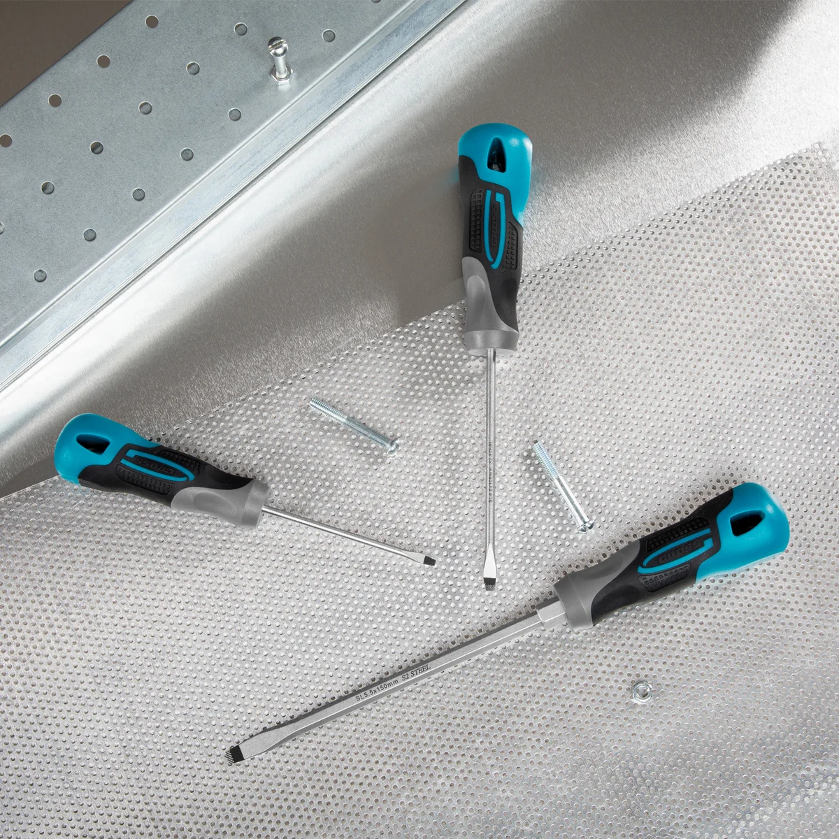 Набор из 3 отверток Gross 12165 из стали S2, с трехкомпонентными рукоятками, используется для монтажа и демонтажа крепежных элементов с профилем SL3, SL4 и SL5,5. Высокое качество отверток позволяет применять их для решения профессиональных задач с повышенными нагрузками. Отвертки в комплекте имеют стержни разной длины 75-150 мм для удобства работы с крепежом как на поверхности, так и в углублениях.Преимущества Долговечность — отвертки изготовлены из высококачественной инструментальной стали S2. Высокий ресурс — благодаря индукционной закалке твердость рабочих частей составляет 56-58 HRC, что обеспечивает им устойчивость к износу. Удобство эксплуатации — специальные насечки и фосфатное покрытие шлицов обеспечивают улучшенное сцепление с крепежом, предотвращая его повреждение. Коррозионная стойкость — хромовое покрытие стержней отверток продлевает срок их службы. Намагниченные наконечники — крепежи надежно удерживаются на шлице отверток, поэтому их удобно направлять в отверстие одной рукой, придерживая закрепляемую деталь. Широкие возможности — шестигранные выступы у основания рукояток позволяют использовать гаечный ключ на 10 мм для увеличения крутящего момента. Крупная и четкая маркировка — на затыльнике каждой рукоятки указан типоразмер шлица, что упрощает поиск нужной отвертки под конкретную задачу. Надежность и комфорт — трехкомпонентные рукоятки крепко соединены со стержнями и обеспечивают удобный хват.