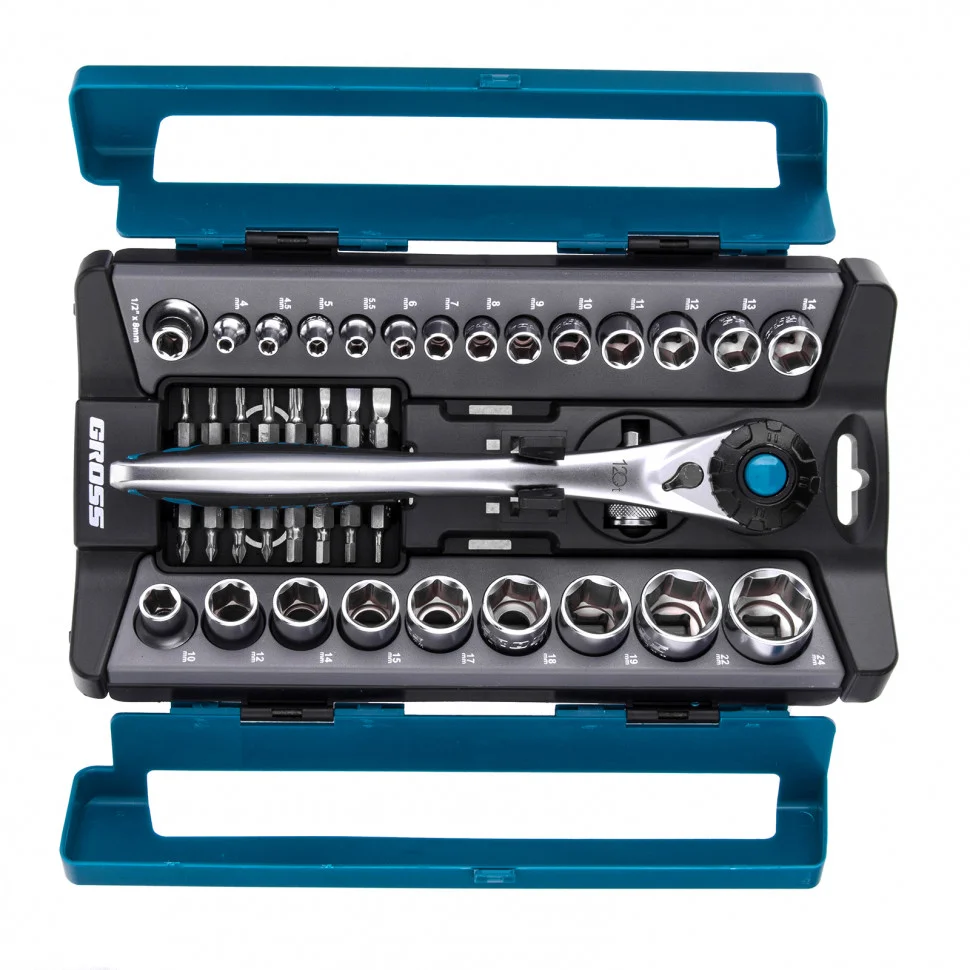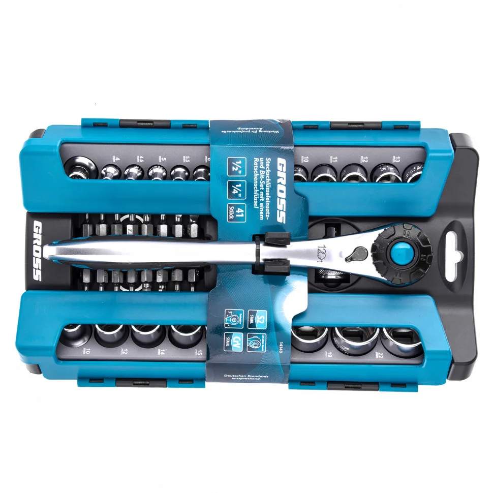 Набор Gross 14143 включает в себя 41 предмет: ключ трещоточный 1/2″, переходник 1/2-1/4″, адаптер, 16 бит и 22 торцевые головки. Применяется для монтажа и демонтажа резьбовых соединений при проведении технического обслуживания авто или для бытовых ремонтных работ. Набор подходит не только для самостоятельного использования в гараже и дома, но и для профессиональной эксплуатации на станциях техобслуживания.