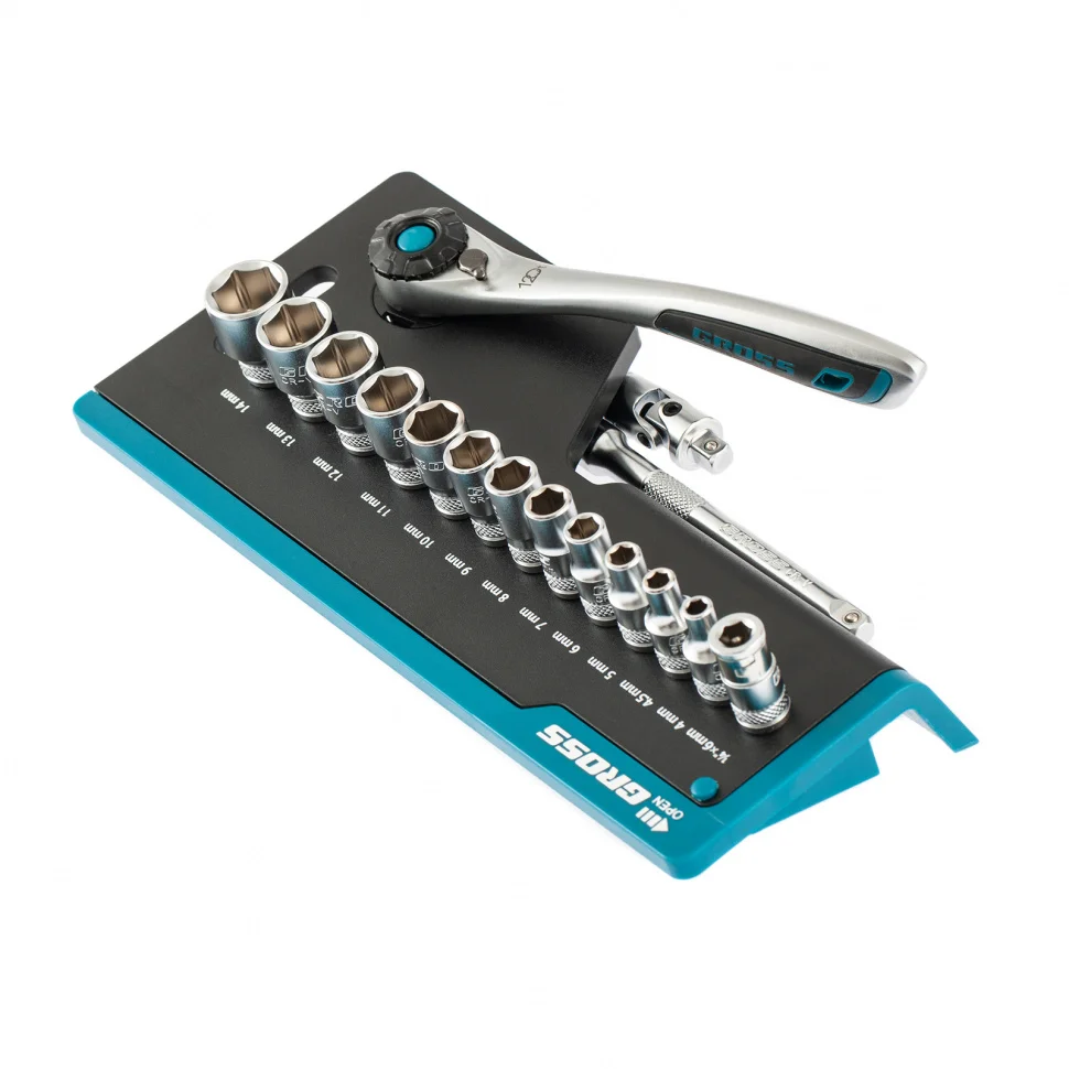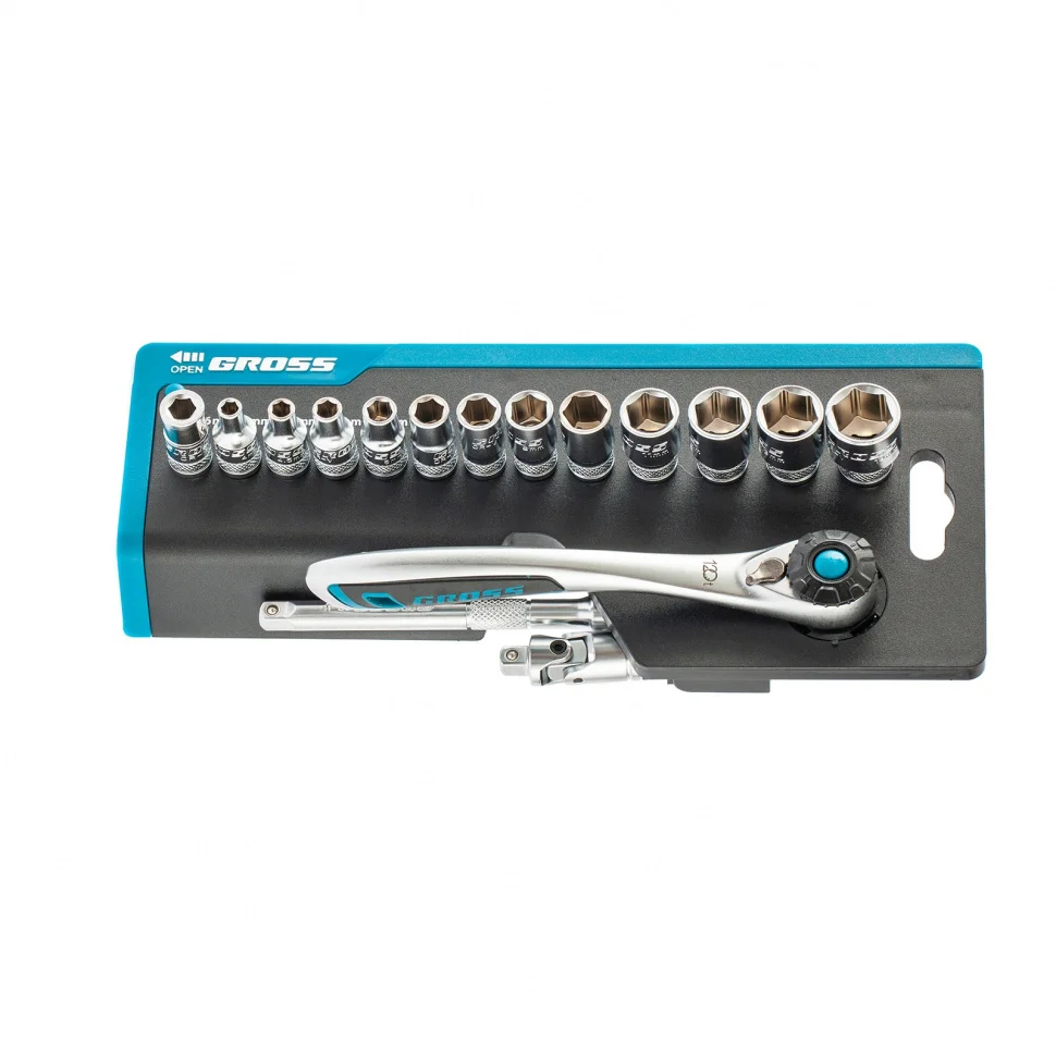 Набор Gross 14142 включает в себя 36 предметов из стали CrV-группы с посадочным квадратом 1/4 дюйма: 12 торцевых головок, трещотку со 120 зубьями, удлинитель 100 мм, шарнир, адаптер и 20 бит. Применяется для монтажа и демонтажа резьбовых соединений при проведении технического обслуживания авто или для бытовых ремонтных работ. Набор подходит не только для самостоятельного использования в гараже и дома, но и для профессиональной эксплуатации на станциях техобслуживания.ПреимуществаПрочность и высокий ресурс — инструменты выполнены из качественной стали хромованадиевой группы.Удобная работа в труднодоступных местах — цельнокованная трещотка со 120 зубьями позволяет вращать крепеж максимально плавно и мягко.Функция быстрого сброса — снять оснастку с трещотки можно одним движением.Наличие реверса — можно быстро менять направление вращения трещотки для легкого перехода от монтажа к демонтажу крепежей.Удобное размещение на стенде — набор инструментов комплектуется подвесной картой.