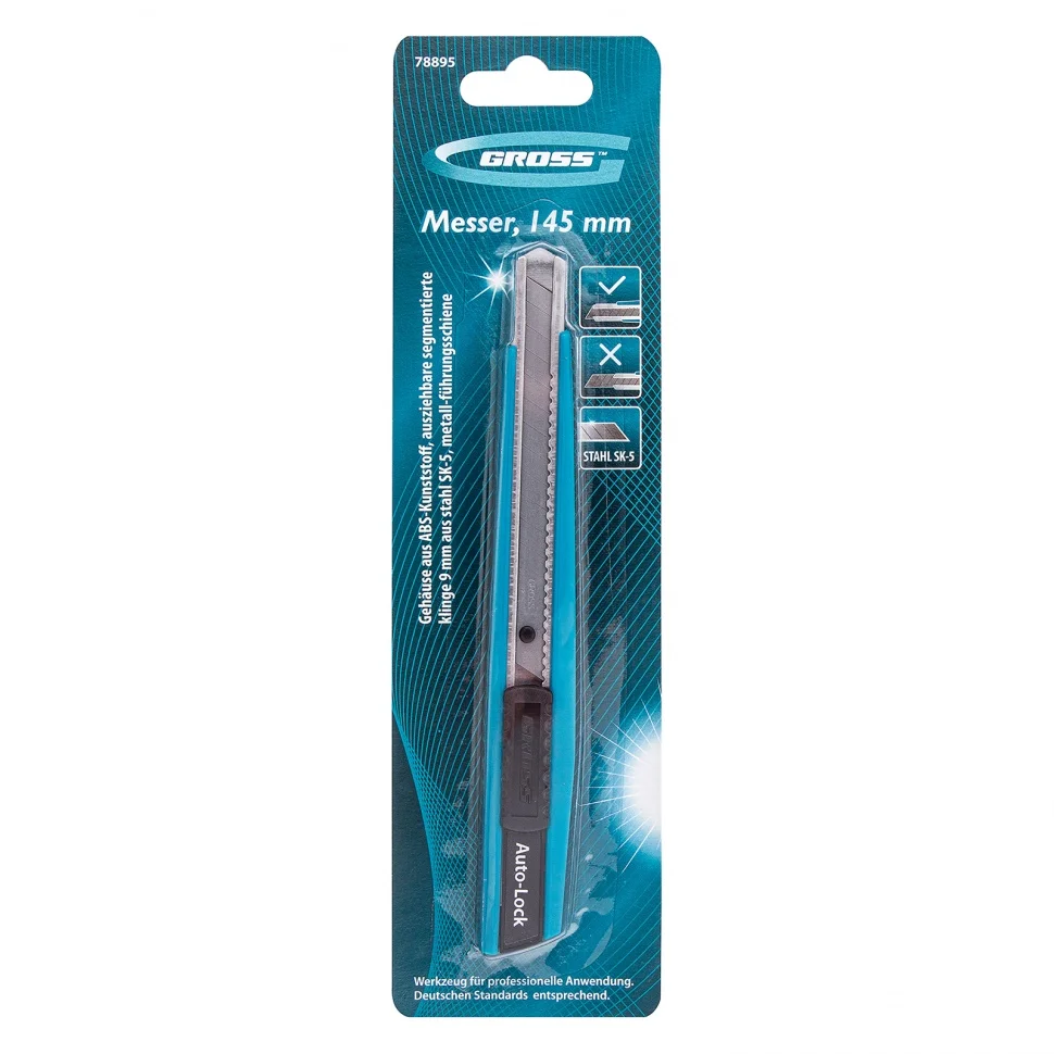 Нож Gross 78895 длиной 145 мм, в корпусе из ABS-пластика, c выдвижным сегментированным лезвием шириной 9 мм из стали SK-5, с металлической направляющей, используется для резания картона, кожи и других мягких материалов. Металлическая направляющая повышает прочность инструмента, что позволяет работать со значительным усилием. Нож будет полезен во время ремонтных и отделочных работ, а также пригодится в быту.ПреимуществаЛезвие толщиной 0,4 мм изготовлено из высококачественной японской стали SK-5, поэтому долго не тупится.Легкий корпус из ударопрочного ABS-пластика устойчив к механическим нагрузкам, а значит, нож прослужит долго и не сломается.У инструмента высокий рабочий ресурс — если лезвие затупится, достаточно отломить износившийся сегмент, и нож снова будет готов к работе.Нож снабжен клипсой, с помощью которой его можно зафиксировать на ремне или в кармане.Клипса одновременно является приспособлением для безопасного обламывания сегмента лезвия.