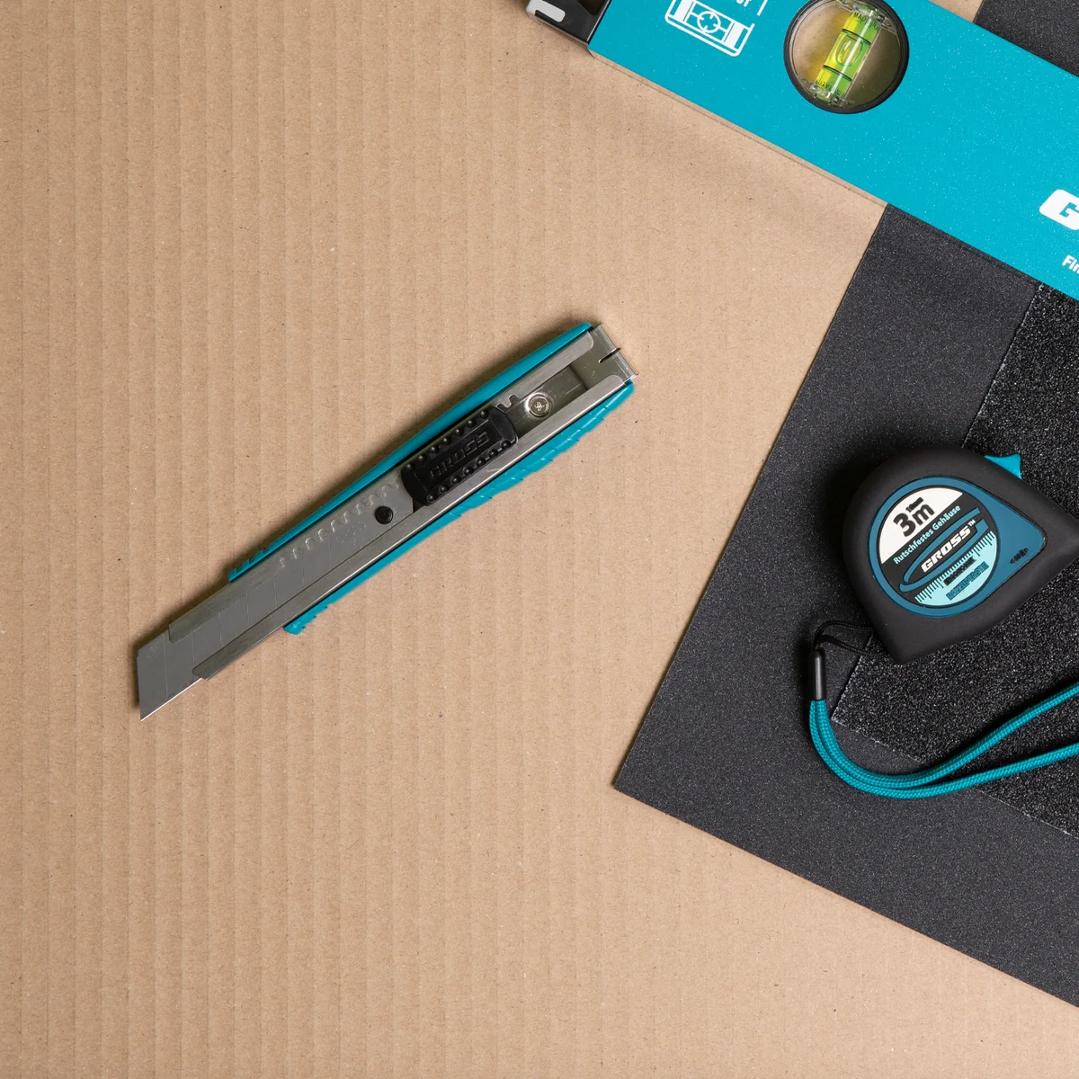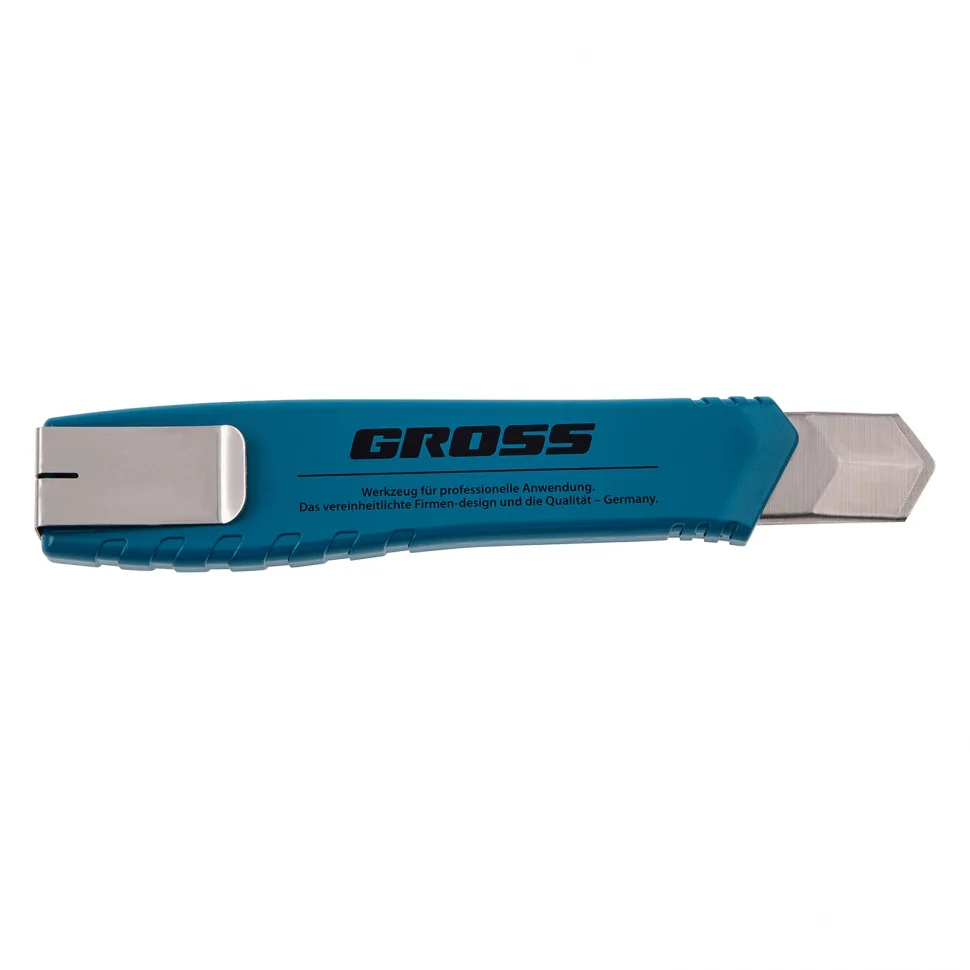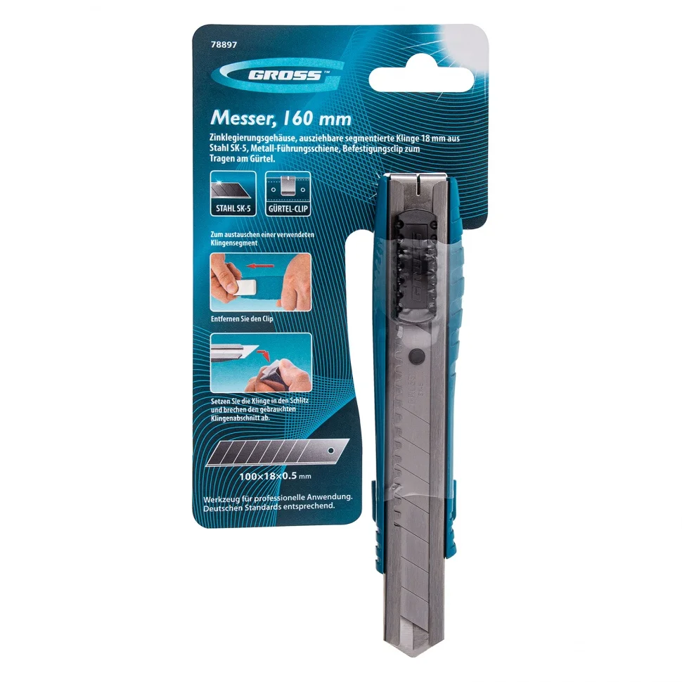 Нож Gross 78897 из стали SK-5, длиной 160 мм, в металлическом корпусе, с выдвижным сегментным лезвием шириной 18 мм, металлической направляющей и клипсой для ремня, — профессиональный инструмент, предназначенный для разрезания линолеума, картона, кожи, обоев и других материалов. Используется при проведении ремонтных и отделочных работ, будет полезен в хозяйстве.ПреимуществаЛезвие толщиной 0,5 мм из прочной и твердой японской стали SK-5 долго сохраняет режущую способность.Металлический корпус увеличивает прочность инструмента, поэтому нож прослужит долго.Полотно состоит из сегментов — достаточно отломить затупившийся, чтобы восстановить работоспособность инструмента.Металлическая клипса позволяет закрепить нож на ремне или в кармане, поэтому инструмент удобен в транспортировке.Прорезь в клипсе служит для обламывания сегментов лезвия, что обеспечивает комфортную и безопасную подготовку к работе.