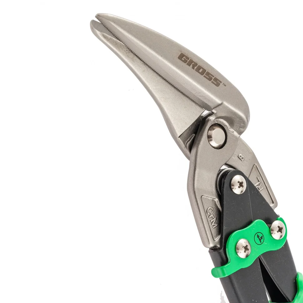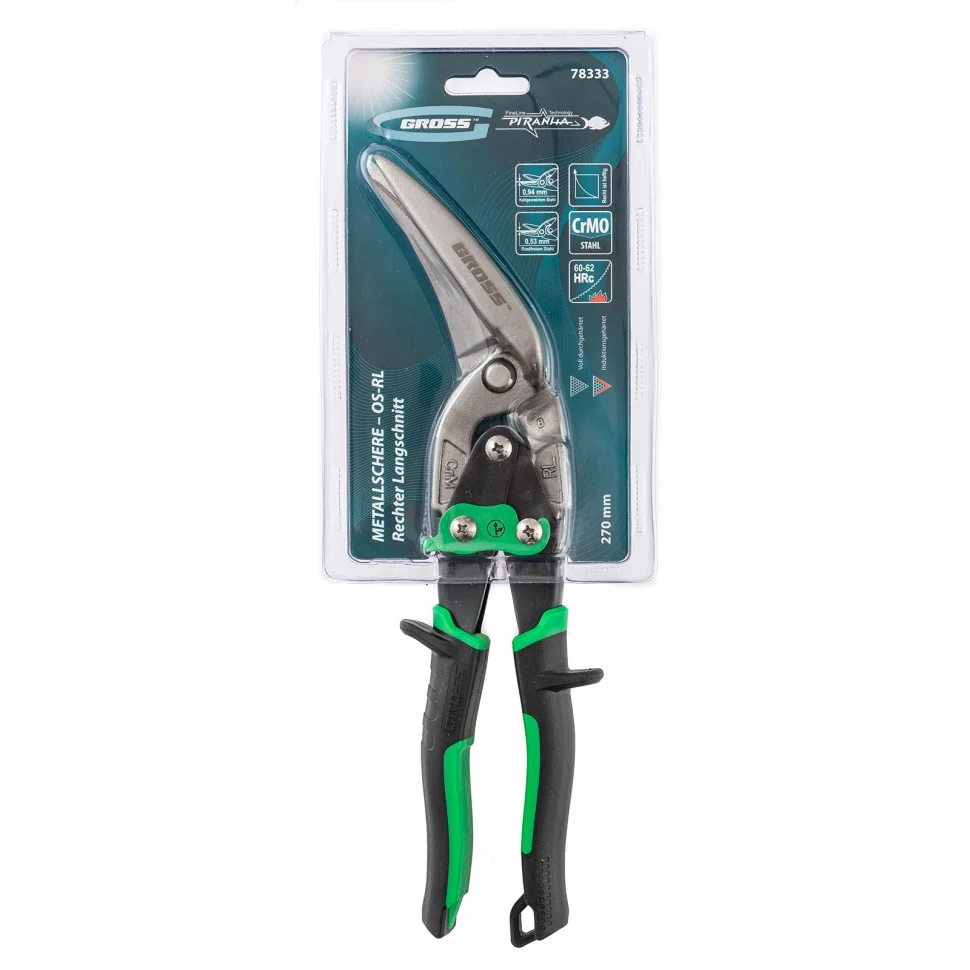 Ножницы по металлу Gross PIRANHA 78333 длиной 270 мм, из стали CrMo, с двухкомпонентными рукоятками, выполняют прямой и правый проходной рез по листовому металлу. Режут не только цветные металлы, но и стали — холоднокатаную толщиной до 0,94 мм и нержавеющую толщиной до 0,53 мм. Нагрузка на руку при этом снижается за счет двойного рычажного механизма. Ножницы рекомендованы для выполнения профессиональных слесарных работ.ПреимуществаРабочие части устойчивы к износу, поскольку изготовлены из высокотвердой стали хромомолибденовой группы.Режущие кромки выдерживают повышенные нагрузки, т.к. они закалены индукционным способом до твердости 60-62 HRC.Лезвия защищены от образования коррозии, т.к. покрыты маслом.Долгая работа не вызывает усталости благодаря двухкомпонентным рукояткам эргономичной формы.Использование ножниц безопасно, поскольку защитные упоры на рукоятках предотвращают соскальзывание пальцев на рабочую часть.Инструмент можно подвесить на инструментальный пояс или крючок для хранения, т.к. на внутренней поверхности рукоятки имеется специальное ушко.Ножницы надежно фиксируются в закрытом положении при помощи блокировочного замка.