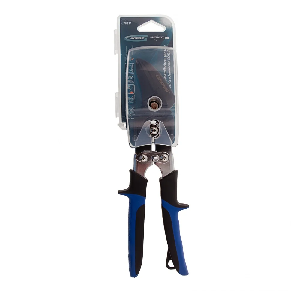 Усиленные ножницы по металлу Gross PIRANHA 78351 длиной 255 мм, из стали CrMo, с двухкомпонентными рукоятками, предназначены для прямого и криволинейного правого реза по листовым заготовкам. Режут металл разных марок толщиной до 1,2 мм, а также нержавеющую сталь толщиной до 0,94 мм. Двойной рычажный механизм уменьшает нагрузку на руку, передавая при этом значительное усилие. Ножницы используются при проведении строительных, монтажных работ, будут полезны и в быту.ПреимуществаПрочность — рабочие части из стали хромомолибденовой группы не деформируются при высоких нагрузках.Высокая режущая способность — лезвия закалены индукционными токами до твердости 60-62 HRC, поэтому успешно справляются с резкой листового металла.Защита от ржавчины — покрытые маслом рабочие части устойчивы к образованию коррозии, поэтому инструмент прослужит долго.Безопасность — блокировочный замок удерживает лезвия в сомкнутом положении во время хранения и транспортировки.Эргономичность — двухкомпонентные рукоятки удобно лежат в руке, а упоры препятствуют соскальзыванию пальцев на рабочую часть, поэтому ножницами комфортно работать.Удобное хранение и перемещение — за ушко на рукоятке инструмент можно подвешивать на инструментальный пояс или на крючок.