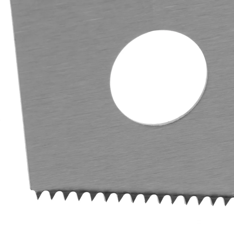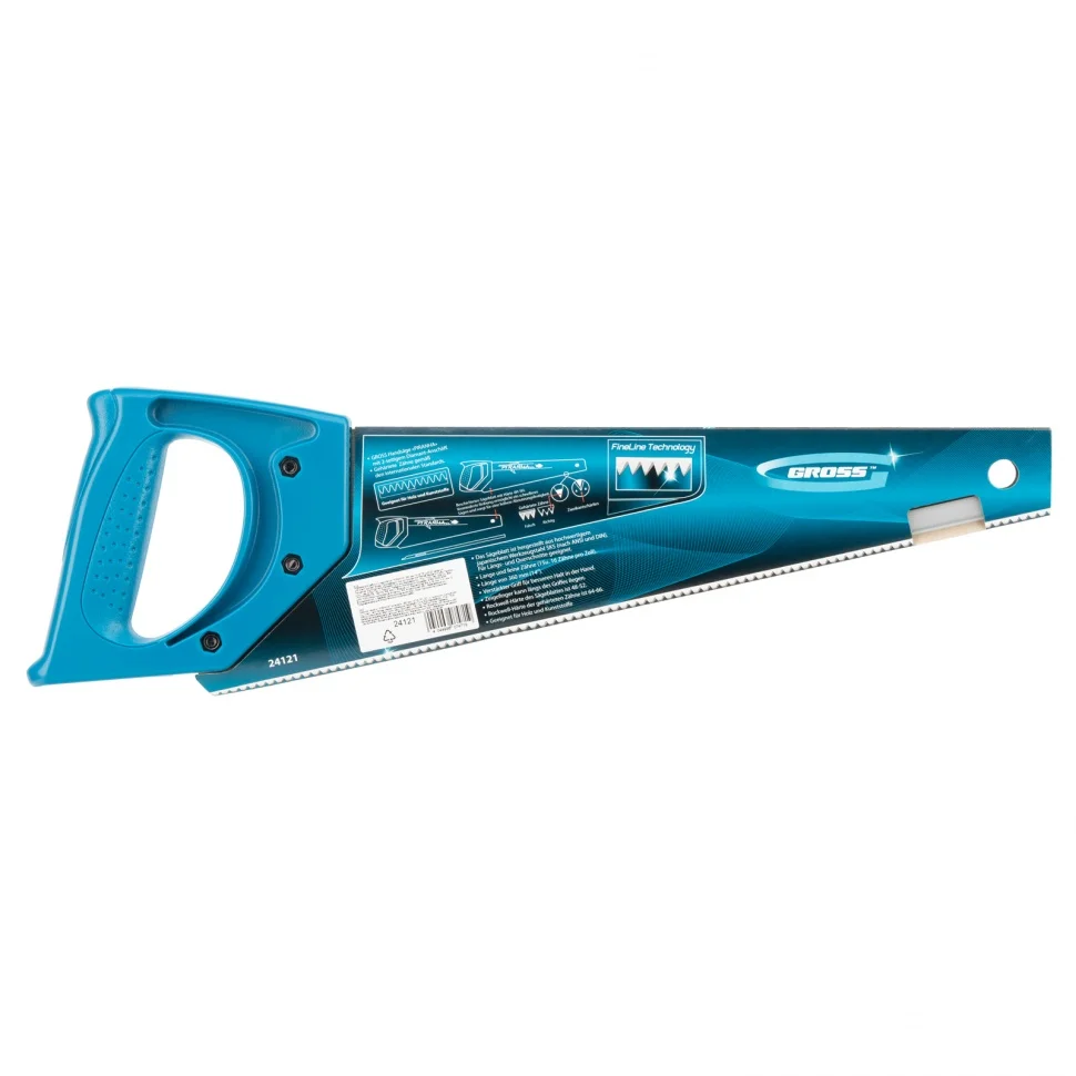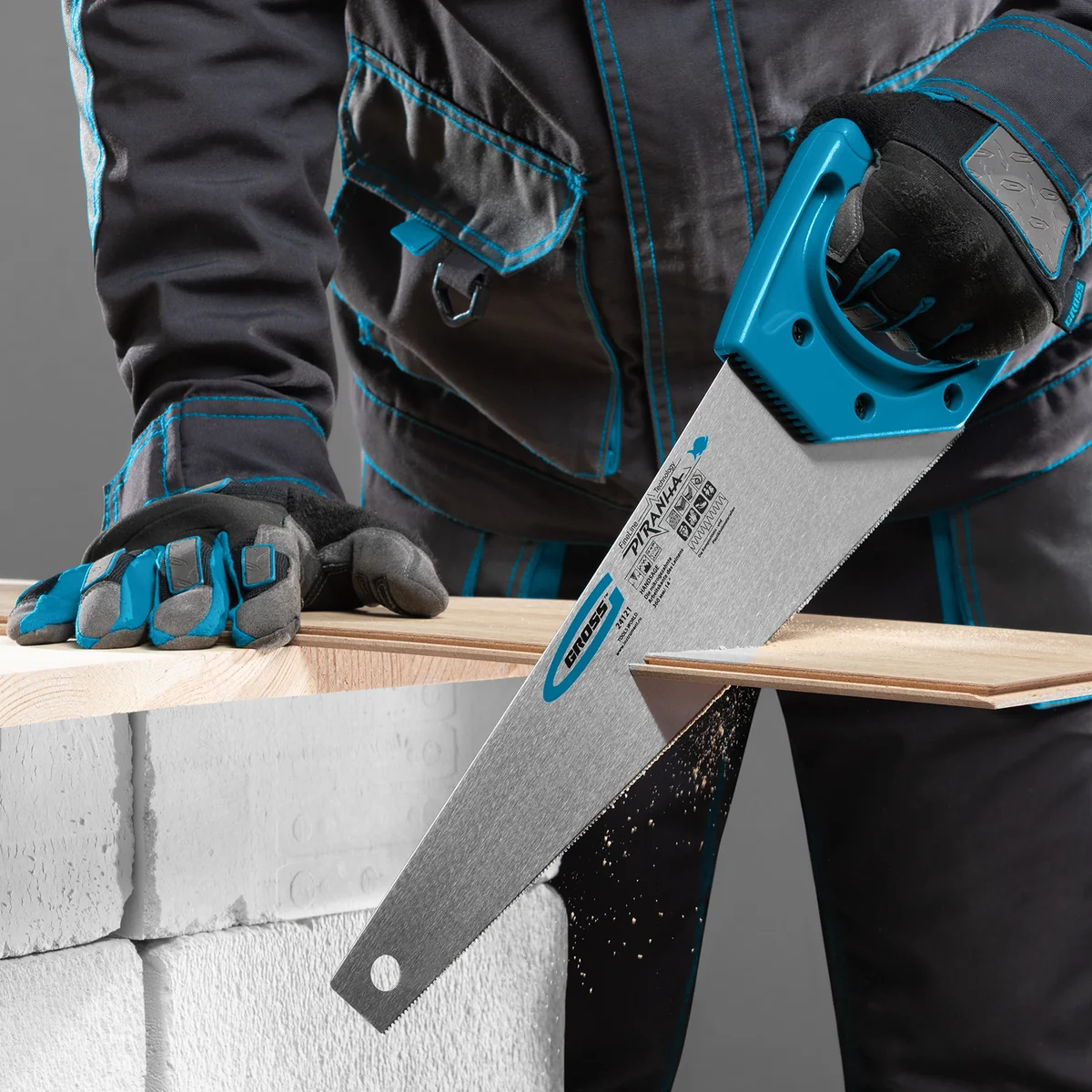 Ножовка для работы с ламинатом Gross PIRANHA 24121 с полотном длиной 360 мм, калеными зубьями с 2D-заточкой и шагом 15-16 TPI, с пластиковой рукояткой, предназначена для работы с композитными и пластическими материалами — ламинатом, МДФ, ДВП, ДСП, пенополистиролом, полиуретаном. Зубья с 2D-заточкой позволяют пилить в направлении как от себя, так и к себе. Благодаря мелким зубьям с шагом 15-16 TPI удается получить максимально тонкий и точный распил. Ножовка будет полезна во время ремонтных и отделочных работ.Преимущества Надежность — полотно из высококачественной японской конструкционной стали SK-5 твердостью 48-52 HRC выдерживает высокие нагрузки, а рукоятка выполнена из ударопрочного ABS-пластика. Эффективная работа — зубья на 2/3 высоты закалены токами высокой частоты и имеют твердость 64-66 HRC, поэтому долго сохраняют остроту. Прочность — основания зубьев не закалены на максимум, благодаря чему снижен риск деформации рабочей части при работе с твердыми материалами. Безопасность — пластиковый чехол предотвращает случайный контакт с режущей кромкой во время хранения или транспортировки инструмента. Коррозионная стойкость — на полотно нанесено защитное полимерное покрытие. Эргономичность — рукоятка удобно ложится в руку, обеспечивая комфорт во время работы. Гарантированное качество — инструмент изготовлен на тайваньском заводе с соблюдением всех технологических требований.