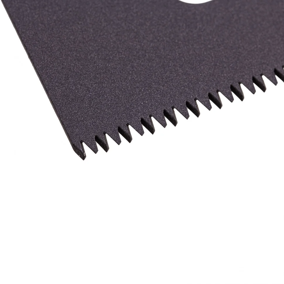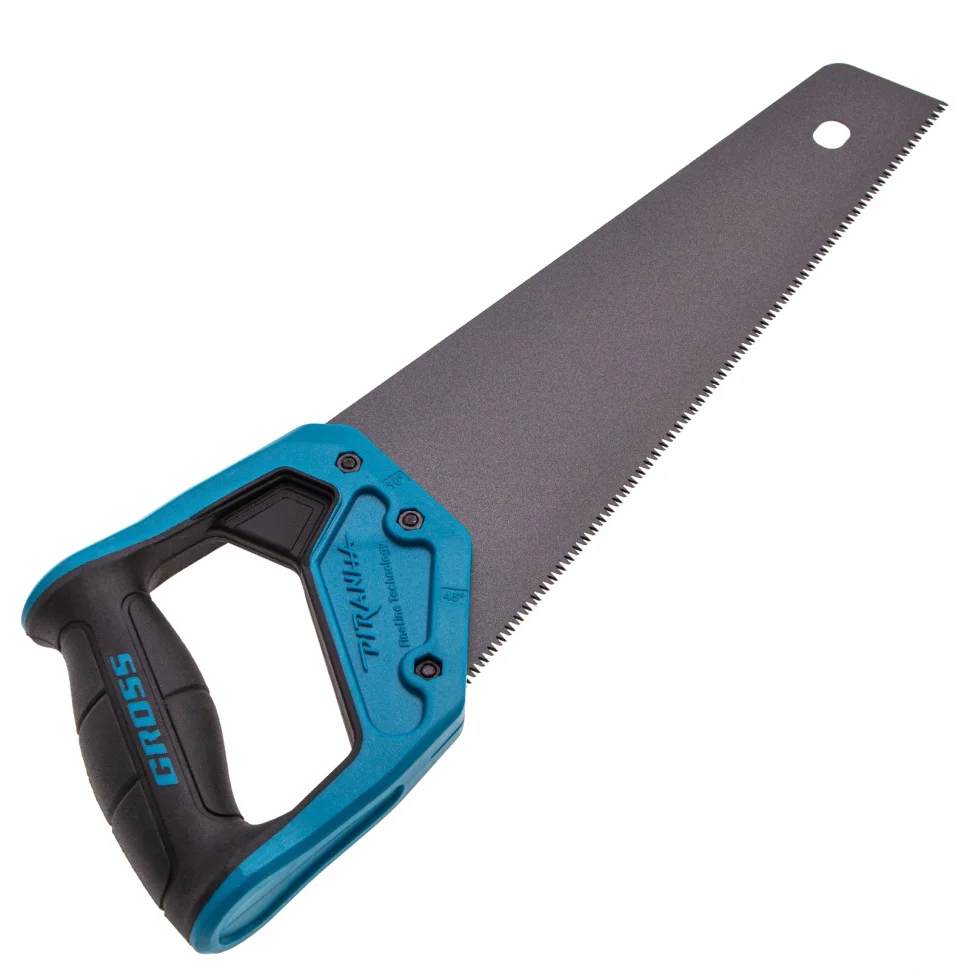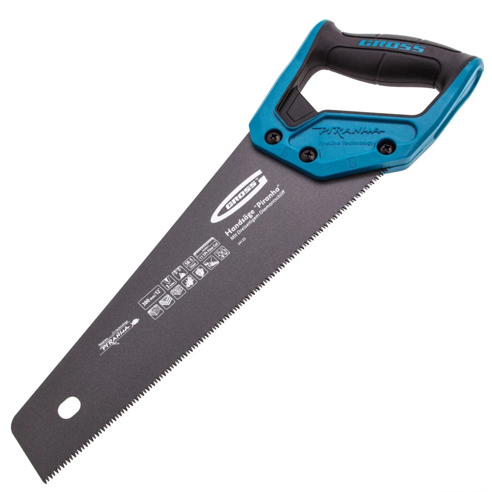 Ножовка по дереву Gross PIRANHA 24125 с полотном длиной 300 мм, калеными зубьями с 3D-заточкой и шагом 11 TPI, с тефлоновым покрытием полотна и 2-компонентной рукояткой, используется для продольного и поперечного распиливания древесины различных пород, МДФ, ДСП, ДВП, ламината, а также пенополистирола, полиуретана и других синтетических материалов. Рабочая часть состоит из мелких зубьев с шагом 2-2,3 мм, что позволяет получить ровный и чистый рез. Трехгранная заточка зубьев увеличивает производительность инструмента без потери качества распиловки. Ножовка предназначена для столярных работ.ПреимуществаПолотно изготовлено из японской пружинной стали SK-5, поэтому характеризуется высокой прочностью и устойчивостью к нагрузкам.Зубья прошли закалку токами высокой частоты и устойчивы к износу, поэтому рабочая кромка долго сохраняет режущие свойства.Поскольку основание зубьев не закалено на максимум, снижается вероятность их слома при пилении твердых материалов или попадании на металлический предмет.На поверхность полотна нанесено тефлоновое покрытие, защищающее инструмент от коррозии и увеличивающее срок его службы.Тефлоновый слой улучшает скольжение полотна, что упрощает распиловку.Двухкомпонентная рукоятка выполнена из ударопрочного ABS-пластика, что повышает надежность ножовки.Рукоятка имеет эргономичную форму и рельефный дизайн, поэтому не скользит в руке и снижает усталость во время длительной работы.Ножовка изготовлена в Тайване по классической технологии и обладает гарантированно высоким качеством.