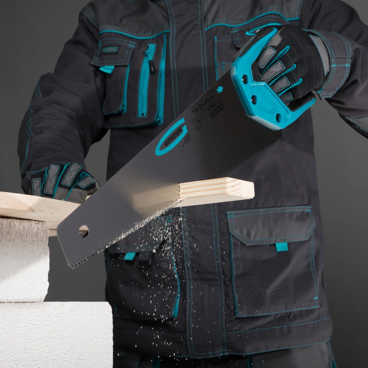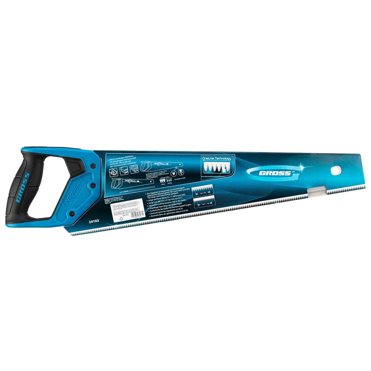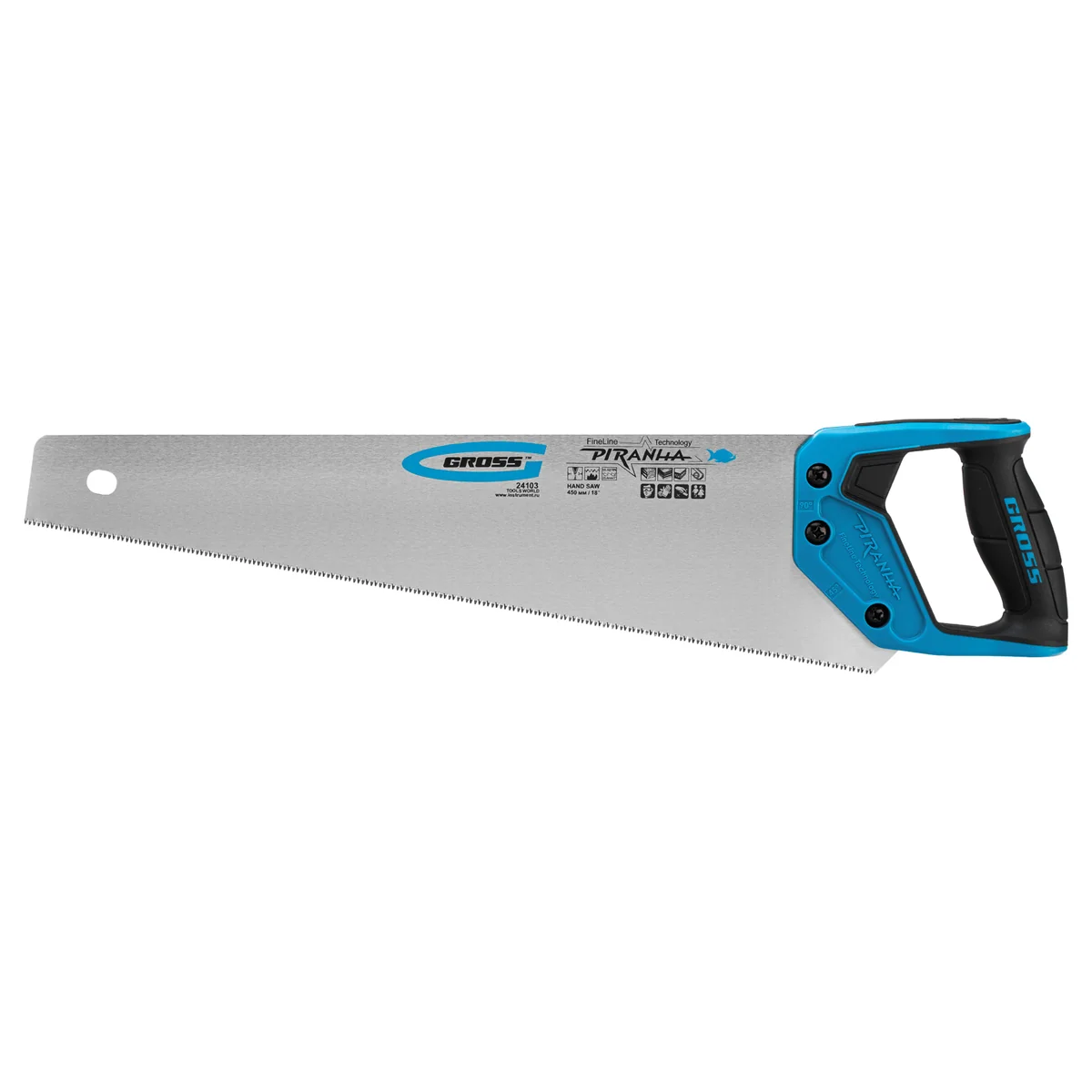 Ножовка по дереву Gross PIRANHA 24103 с полотном длиной 450 мм, калеными зубьями с 3D-заточкой и шагом 11-12 TPI, 2-компонентной рукояткой, предназначена для распиловки заготовок из древесины, ДСП, ДВП, МДФ и ламината, а также из пластических материалов, таких как пенополистирол и полиуретан. Может производить продольный и поперечный распил. Мелкие зубья с шагом 11-12 TPI позволяют выполнять точный и чистый рез. Ножовка обладает высокой производительностью благодаря трехгранной заточке зубьев. Инструмент используется в столярном деле.Преимущества Надежность — полотно изготовлено из высококачественной японской стали SK-5, а рукоятка — из ударопрочного ABS-пластика. Эффективная работа — зубья, закаленные токами высокой частоты, долго держат заточку. Прочность — закалка зубьев на 2/3 высоты уменьшает вероятность их слома при обработке древесины твердых пород. Коррозионная стойкость — на полотно нанесено защитное полимерное покрытие. Комфорт во время работы — благодаря эргономичной форме и рифленой поверхности рукоятка удобно ложится в руку и не скользит в ладони. Гарантированное качество — инструмент изготовлен на тайваньском заводе с соблюдением всех технологических требований.