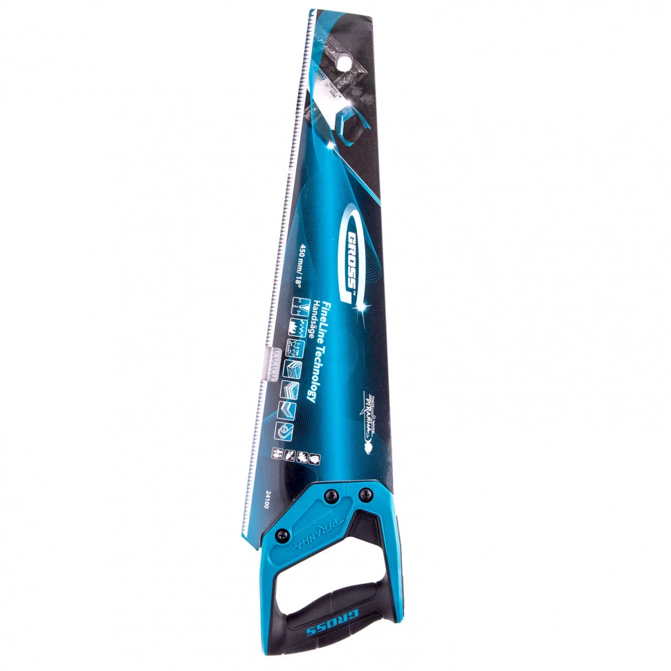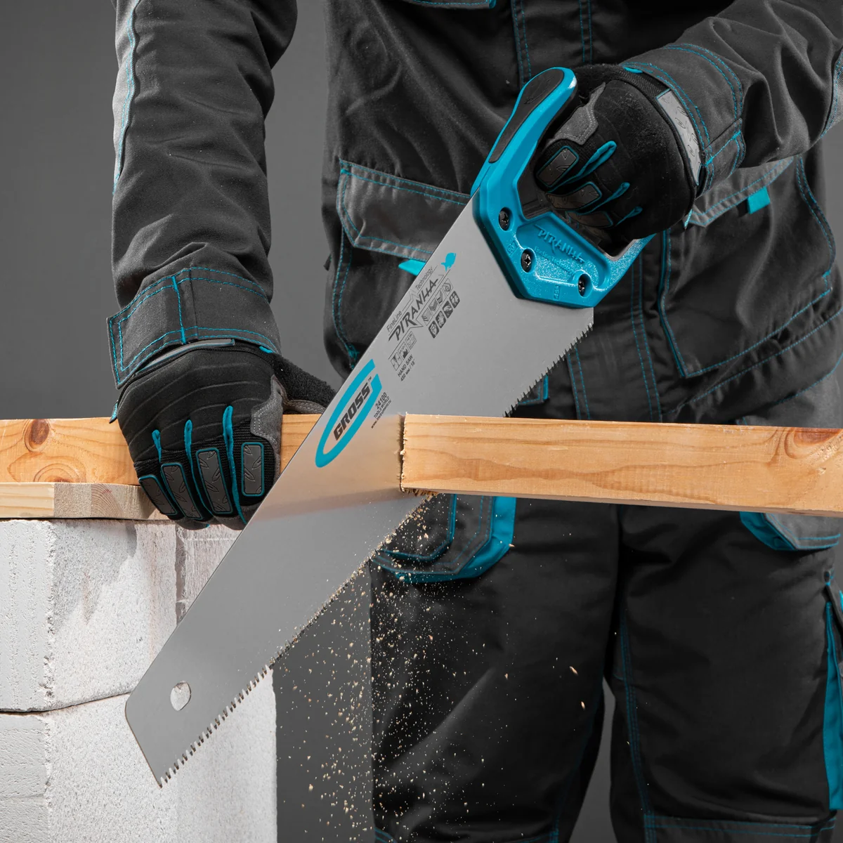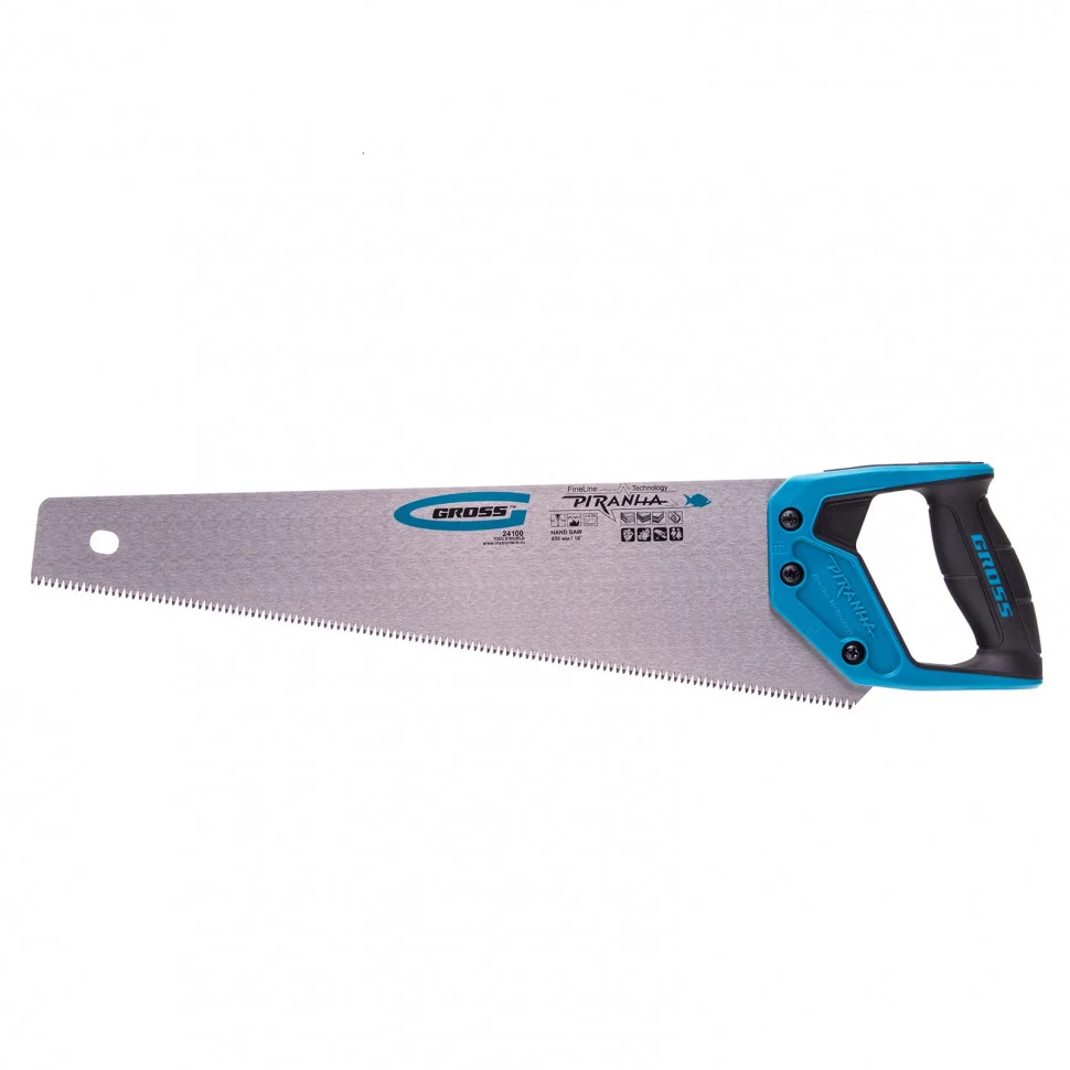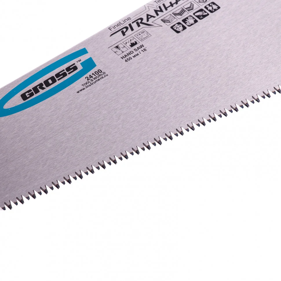 Ножовка по дереву Gross PIRANHA 24100 с полотном длиной 450 мм, калеными зубьями с 3D-заточкой и шагом 7-8 TPI, с 2-компонентной рукояткой, используется для распиливания древесины, МДФ, ДСП, ДВП, ламината, а также пенополистирола, полиуретана и других пластических материалов. Подходит для продольного и поперечного пиления. Зубья имеют универсальный шаг 7-8 TPI, поэтому ножовка подходит для решения широкого спектра задач. Трехгранная заточка зубьев обеспечивает максимальную производительность и высокое качество пиления. Ножовка предназначена для столярных и плотницких работ, пригодится во время ремонта и будет полезна в быту.Преимущества Надежность — полотно изготовлено из высококачественной японской стали SK-5, а рукоятка — из ударопрочного ABS-пластика. Износостойкость — зубья прошли дополнительную закалку и долго сохраняют остроту. Прочность — закалка зубьев на 2/3 высоты уменьшает вероятность их слома при обработке древесины твердых пород. Коррозионная стойкость — на полотно нанесено защитное полимерное покрытие. Комфортная работа — эргономичная рукоятка с рифленой поверхностью удобно ложится в руку и не скользит. Гарантированное качество — инструмент изготовлен на тайваньском заводе с соблюдением всех технологических требований.