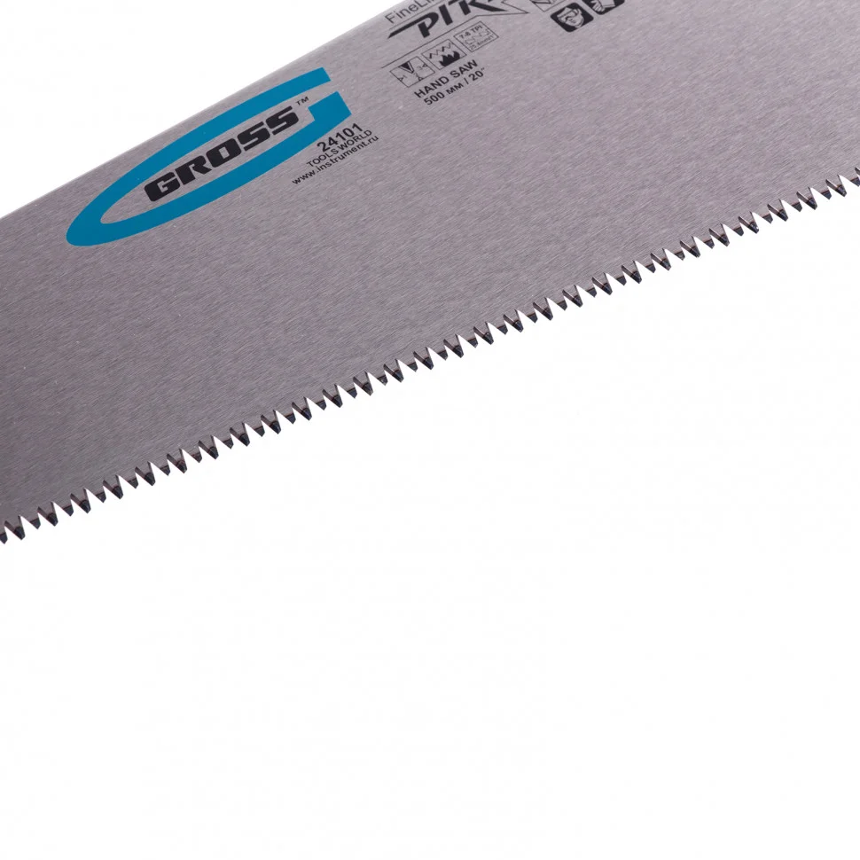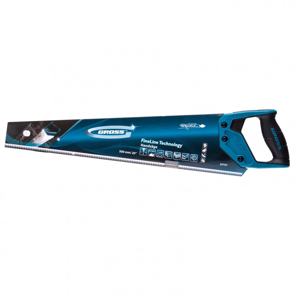 Ножовка по дереву Gross PIRANHA 24101 с полотном длиной 500 мм, калеными зубьями с 3D-заточкой и шагом 7-8 TPI, 2-компонентной рукояткой, используется для распиливания древесины, МДФ, ДСП, ДВП, ламината, а также пенополистирола, полиуретана и других пластических материалов. Подходит для продольного и поперечного пиления. Зубья имеют универсальный шаг 7-8 TPI, поэтому ножовка подходит для решения широкого спектра задач. Трехгранная заточка зубьев обеспечивает максимальную производительность и высокое качество пиления. Ножовка предназначена для столярных и плотницких работ, пригодится во время ремонта и будет полезна в быту.Преимущества Полотно изготовлено из японской стали SK-5, обладающей высокими прочностными характеристиками. Зубья закалены токами высокой частоты, что обеспечивает повышенную износостойкость рабочей части. Закалка зубьев на 2/3 высоты уменьшает вероятность их слома при обработке древесины твердых пород. На полотно нанесено полимерное покрытие для защиты от коррозии. Рукоятка выполнена из ударопрочного ABS-пластика, что увеличивает срок службы инструмента. Благодаря эргономичной форме и рифленой поверхности рукоятка удобно ложится в руку и не скользит, обеспечивая комфорт во время интенсивной работы. Инструмент изготовлен на тайваньском заводе с соблюдением всех технологических требований, что гарантирует его надежность.