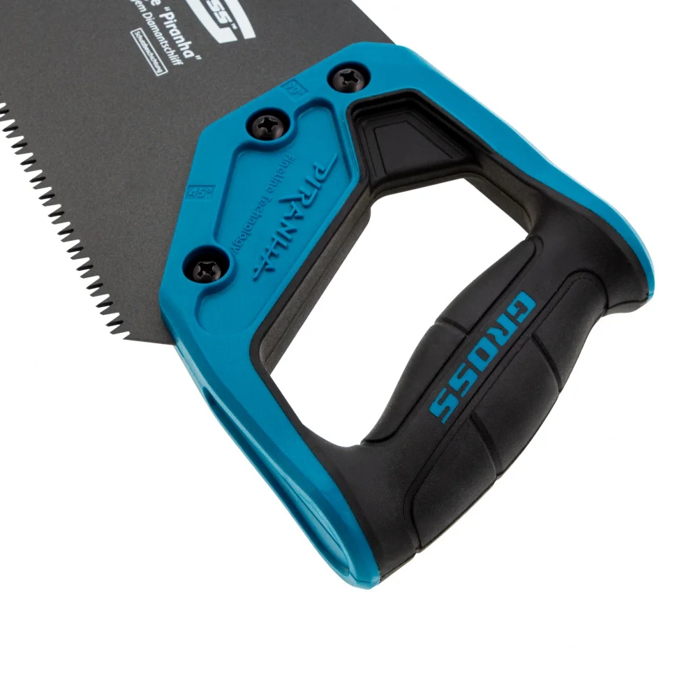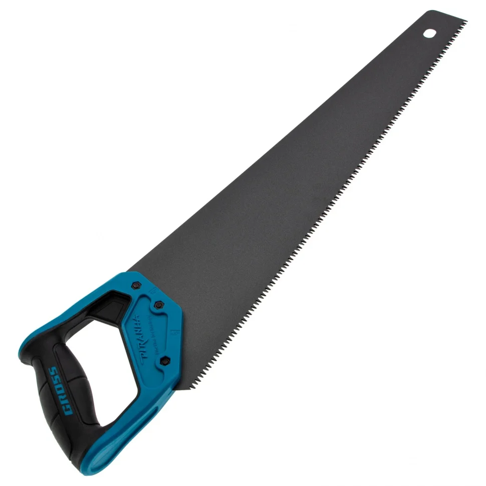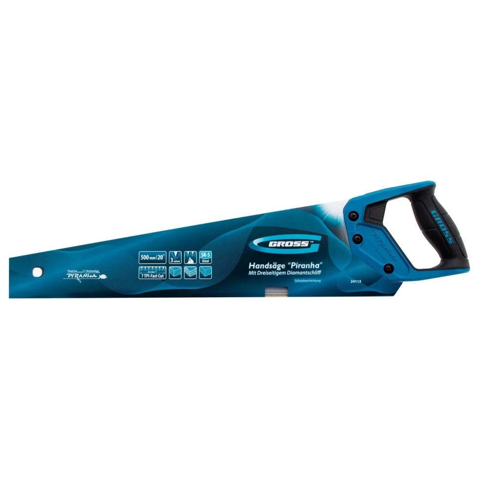 Ножовка по дереву Gross PIRANHA 24115 с полотном длиной 500 мм, калеными зубьями с 3D-заточкой и шагом 7 TPI, с тефлоновым покрытием полотна и 2-компонентной рукояткой, используется для продольного и поперечного распиливания древесины различных пород, МДФ, ДСП, ДВП, ламината, а также пенополистирола, полиуретана и других синтетических материалов. Рабочая часть состоит из крупных зубьев поэтому ножовка подходит для решения широкого спектра задач. Трехгранная заточка зубьев увеличивает производительность инструмента без потери качества распиловки. Ножовка предназначена для столярных работ.ПреимуществаПолотно изготовлено из японской пружинной стали SK-5, поэтому характеризуется высокой прочностью и устойчивостью к нагрузкам.Зубья прошли закалку токами высокой частоты и устойчивы к износу, поэтому рабочая кромка долго сохраняет режущие свойства.Поскольку основание зубьев не закалено на максимум, снижается вероятность их слома при пилении твердых материалов или попадании на металлический предмет.На поверхность полотна нанесено тефлоновое покрытие, защищающее инструмент от коррозии и увеличивающее срок его службы.Тефлоновый слой улучшает скольжение полотна, что упрощает распиловку.Двухкомпонентная рукоятка выполнена из ударопрочного ABS-пластика, что повышает надежность ножовки.Рукоятка имеет эргономичную форму и рельефный дизайн, поэтому не скользит в руке и снижает усталость во время длительной работы.Ножовка изготовлена в Тайване по классической технологии и обладает гарантированно высоким качеством.