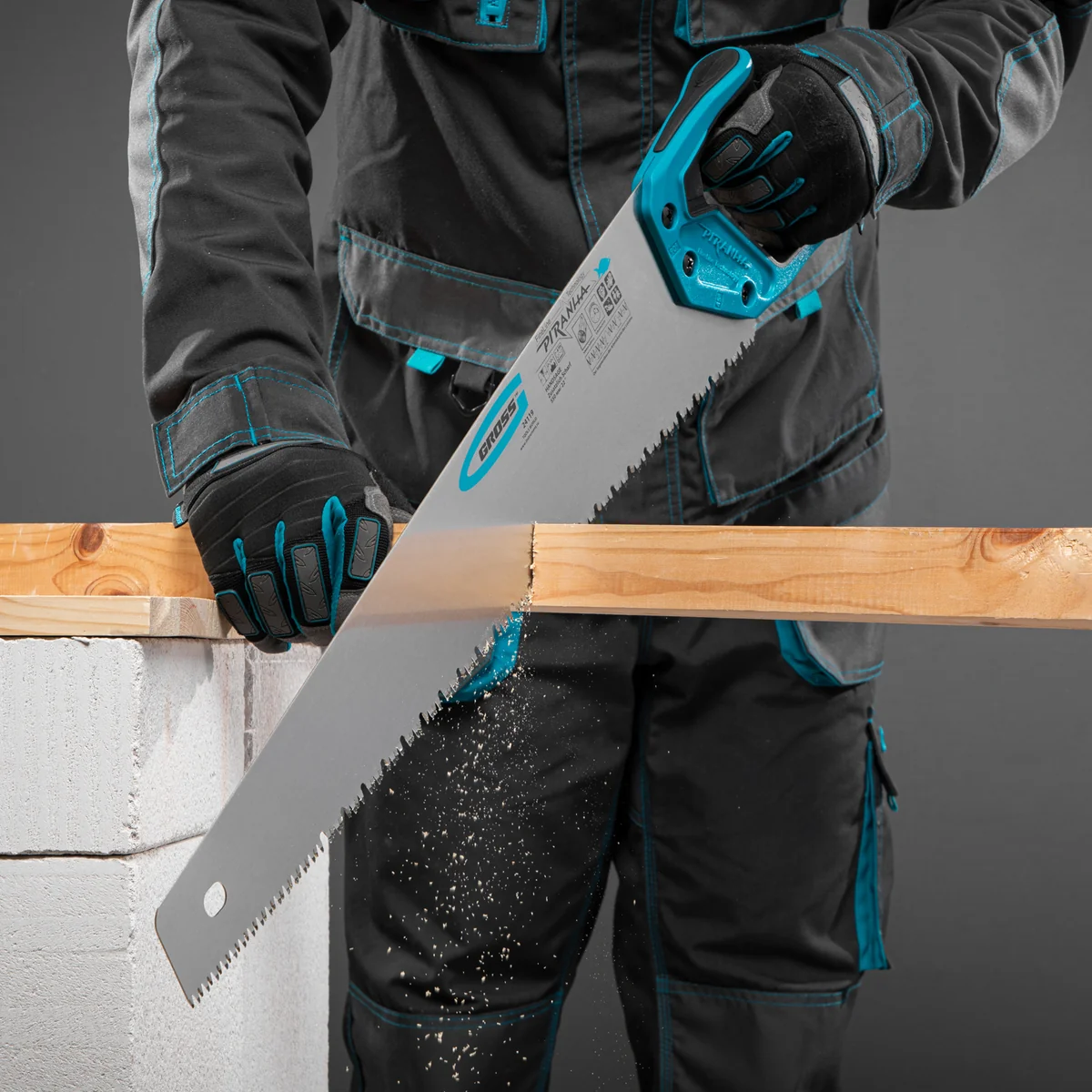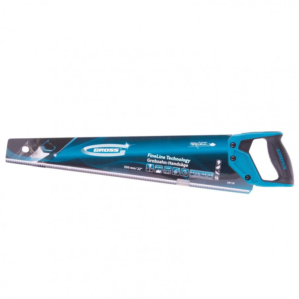 Ножовка по дереву Gross PIRANHA 24119 с полотном длиной 550 мм, зубьями с 3D-заточкой и шагом 7-8 TPI, с 2-компонентной рукояткой, имеет сегментное строение рабочей кромки и предназначена для продольного и поперечного распиливания древесины, МДФ, ДСП, ДВП, а также пенополистирола, полиуретана и других синтетических материалов. Зубья с универсальным шагом 7-8 TPI обеспечивают быстрый и ровный рез, а их трехгранная заточка увеличивает производительность ножовки. Разделение рабочей кромки на сегменты улучшает отвод стружки, благодаря чему полотно не застревает в материале заготовки. Ножовка пригодится столярам, плотникам, а также будет полезна домашним мастерам.Преимущества Полотно обладает высокой прочностью и упругостью, поскольку изготовлено из высококачественной японской стали SK-5. Режущая кромка долго сохраняет остроту, т.к. зубья прошли закалку токами высокой частоты. Зубья отличаются повышенной устойчивостью к слому благодаря селективной закалке. Вероятность образования коррозии снижена, поскольку на полотно нанесено защитное лаковое покрытие. Рукоятка устойчива к механическим повреждениям, т.к. выполнена из ударопрочного ABS-пластика. Работа с ножовкой не вызывает дискомфорт благодаря эргономичной форме рукоятки. Ножовка отличается высоким качеством, поскольку изготовлена на современном заводе в Тайване с соблюдением всех технологических норм.