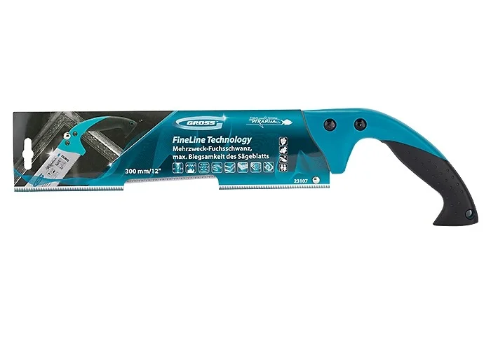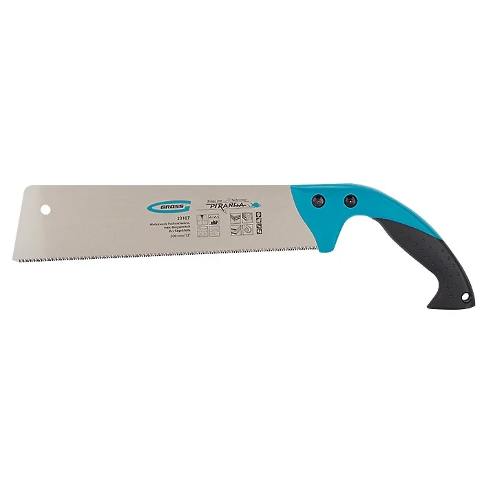 Многофункциональная ножовка по дереву Gross PIRANHA 23107, 300 мм, с калеными 3D-зубьями с шагом 14-15 TPI, — режущий инструмент с предельной гибкостью полотна. Используется для пиления древесины, фанеры, ДСП, ДВП, МДФ, ламината, а также пенополистирола, полиуретана и других синтетических материалов. Рабочая часть состоит из мелких зубьев с шагом 14-15 TPI, поэтому распил получается ровным и гладким. Трехгранная заточка зубьев обеспечивает высокую производительность инструмента. Ножовка будет полезна в столярной мастерской, пригодится также во время ремонта.ПреимуществаПолотно изготовлено из высококачественной японской стали SK-5, поэтому обладает повышенной механической прочностью.Зубья прошли закалку токами высокой частоты, что придает им особую твердость и износостойкость.На полотно нанесено тефлоновое покрытие, защищающее его от коррозии.Тефлоновое покрытие снижает трение полотна о распиливаемый материал, что повышает скорость работы.Двухкомпонентная рукоятка выполнена из ударопрочного пластика, что увеличивает надежность инструмента.Эргономичная рукоятка удобно лежит в руке, снижая нагрузку на кисть во время длительной работы.
