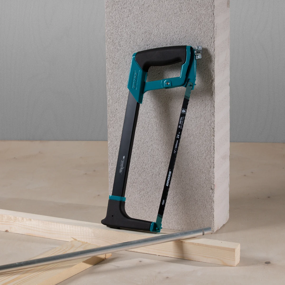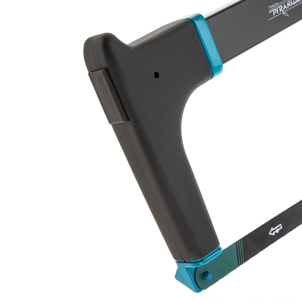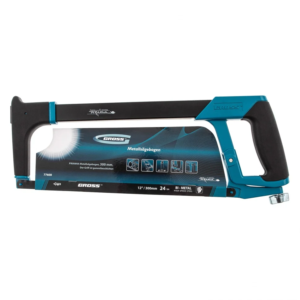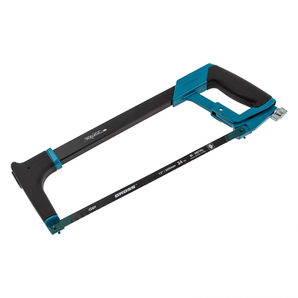 Ножовка Gross «PIRANHA» 77600 длиной 300 мм, с обрезиненной рукояткой и захватом, используется для работ по металлу. Рез получается точным и аккуратным за счет рычажно-винтового механизма, обеспечивающего оптимальную силу натяжения полотна. Конструкция рамки инструмента позволяет устанавливать полотна под углом 45 и 90 градусов, что расширяет спектр выполняемых работ.ПреимуществаДолговечность — биметаллическое полотно с зубьями из быстрорежущей стали устойчиво к износу.Надежность — корпус ножовки изготовлен из прочного алюминиевого сплава.Высокое качество реза — шаг зуба полотна составляет 24 TPI, что позволяет быстро и точно распиливать заготовки даже из твердых металлов.Защита от коррозии — эмалевое покрытие предотвращает образование ржавчины при работе на открытом воздухе и в условиях повышенной влажности.Расширенный функционал — в раме имеется паз для установки лезвия, что дает возможность производить рез по типу ножа.Комфортная эксплуатация — прорезиненные рукоятка и захват обеспечивают надежный хват и уменьшают нагрузку на руку мастера.