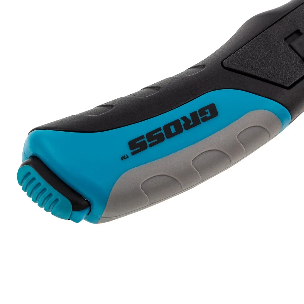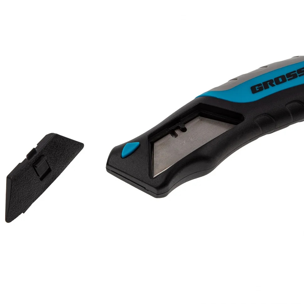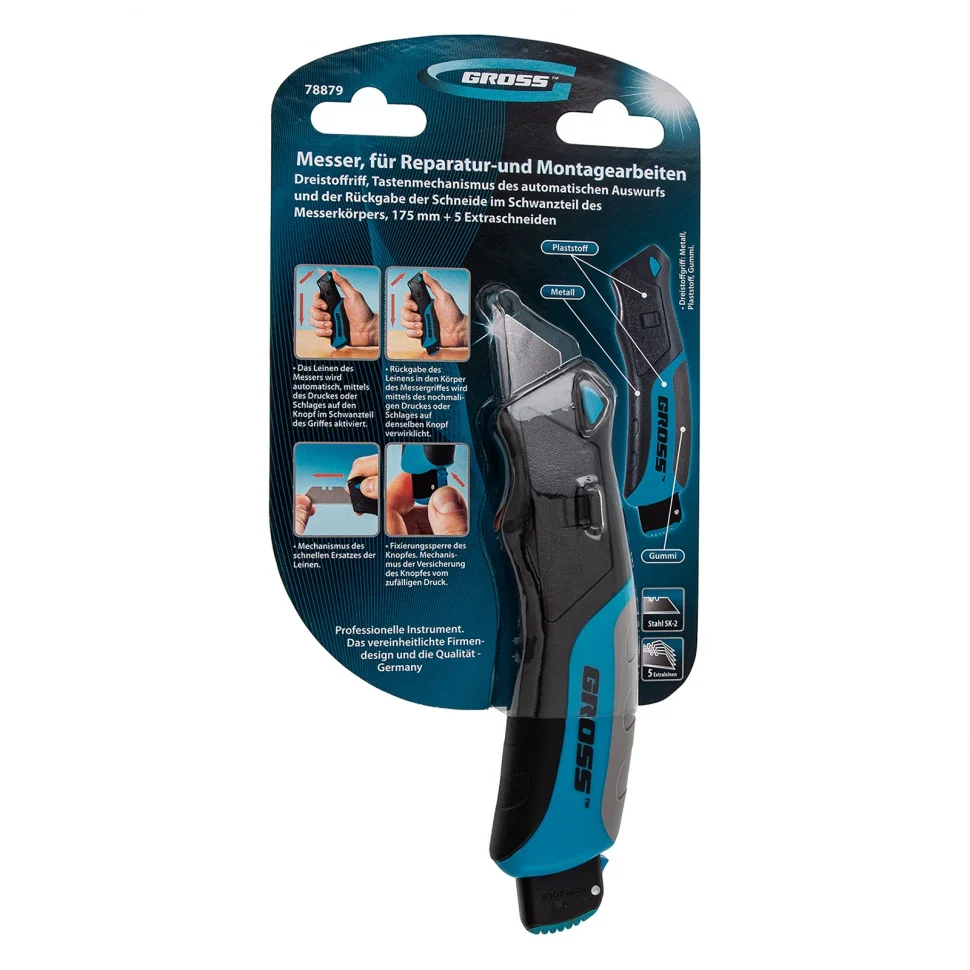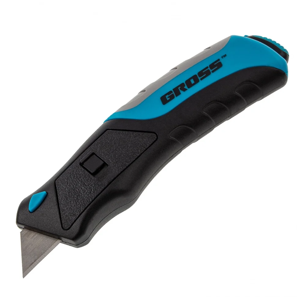 Нож ремонтно-монтажный, трехкомпонентная рукоятка, кнопочный автовыброс, возврат лезвия, 175 мм, 5 запасных лезвий Gross 78879
