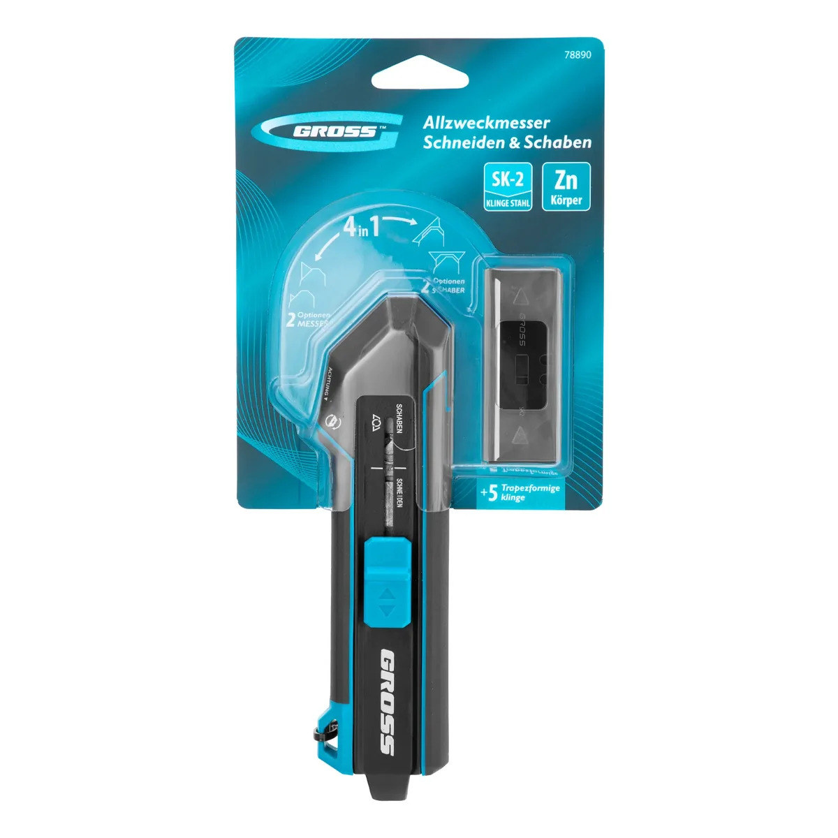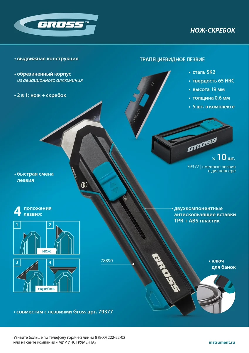 Нож-скребок выдвижной, 19мм, сменное лезвие, SK2, 5 запас. лезвий, алюмин. корпус GROSS 78890