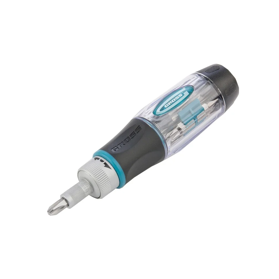 Набор Gross 11607 включает в себя реверсивную отвертку с телескопическим магнитным стержнем, мини-отвертку, сменные насадки из стали S2 — 11 бит 1/4 дюйма и 2 двусторонние биты для точных работ. Инструменты предназначены для монтажа/демонтажа крепежных элементов со шлицами PH, SL, TORX и HEX. Отвертка пригодится как частным мастерам, так и профессионалам при выполнении монтажных, строительных и ремонтных работ. При необходимости вместе с отверткой можно использовать любые насадки длиной 25 мм — как биты с хвостовиком 1/4 дюйма, так и биты для точных работ. ПреимуществаБиты изготовлены из инструментальной легированной стали S2, прошедшей термообработку до твердости 54-58 HRC.Реверсивный механизм упрощает проведение работ и позволяет менять направление вращения.Мини-отвертка позволяет проводить точные работы с мелкими деталями.Наконечники бит намагничены, поэтому крепеж можно зафиксировать для удобства работы.С помощью телескопического магнитного стержня можно извлекать крепежные элементы из труднодоступных мест.Благодаря специальной полости внутри отвертки можно компактно и удобно хранить барабан с битами.Рукоятка отвертки выполнена из поликарбоната, отличается прочностью и долговечностью.Фирменный штамп подтверждает оригинальность отвертки, предотвращая подделку продукции.