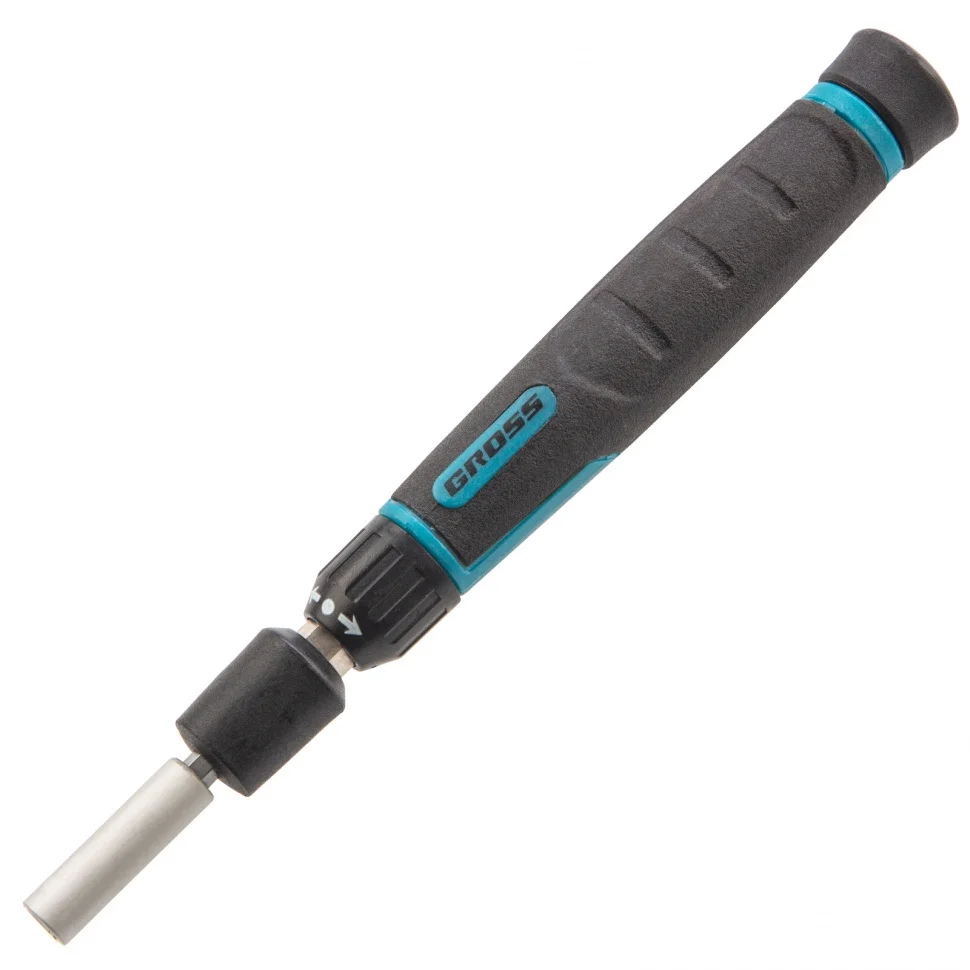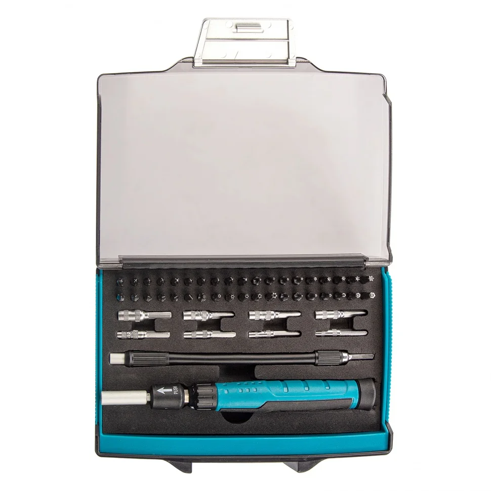 Отвертка с набором бит и торцевых головок Gross 11599, с гибким приводом, входит в набор из 48 предметов из стали CrMo и рассчитана на выполнение точных работ. С ее помощью можно отремонтировать очки, игрушки, портативную и бытовую технику и т.д. Выдвижной стержень и гибкий удлинитель позволяют работать с мелкими деталями в углублениях и труднодоступных местах.ПреимуществаПрочность и долговечность — насадки изготовлены из стали CrMo и закалены до твердости 54-56 HRC.Удобная эксплуатация — реверсивный механизм значительно повышает скорость работы, а вращающийся затыльник позволяет поворачивать отвертку перебором пальцев.Намагниченные биты — металлический крепеж легко доставать из углублений и направлять одной рукой.Комфортная работа — эргономичная двухкомпонентная рукоятка удобно лежит в руке.Продуманное хранение и транспортировка — набор упакован в пластиковый жесткий кейс с надежной защелкой.
