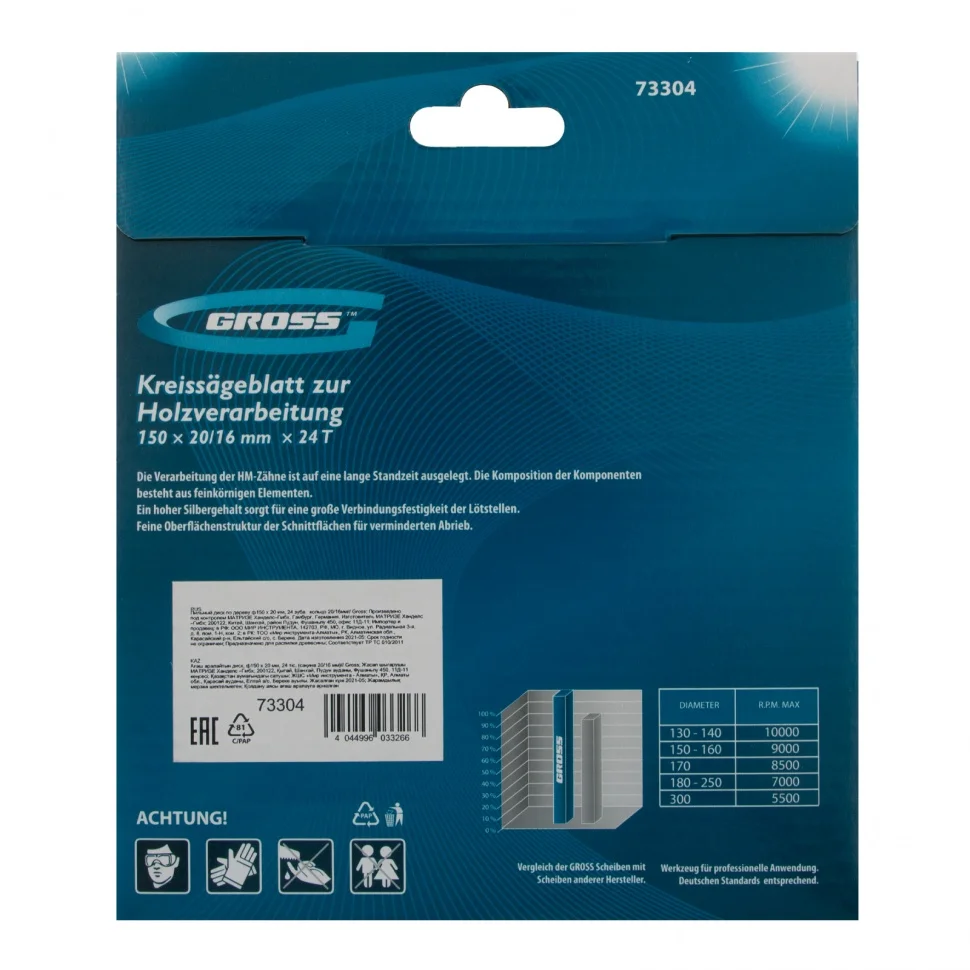 Пильный диск Gross 73304, ф150 х 20 мм, с 24 зубьями и переходным кольцом 20/16 мм, предназначен для распила древесины мягких и твердых пород, ДСП, МДФ и фанеры. Является оснасткой для циркулярных и торцовочных пил с посадочным диаметром 20 мм, благодаря универсальному типу зубьев АТВ подходит как для продольного, так и для поперечного реза материалов. Диск изготовлен на высококачественном оборудовании, специально рассчитан на профессиональное применение и выполнение большого объема работ.Преимущества Высокое качество работ — 24 крупных зуба и режущие кромки, прошедшие многоступенчатую автоматическую заточку, обеспечивают быстрый и точный рез материалов. Прочность — корпус изготовлен из инструментальной стали 65Mn и термообработан, поэтому обладает устойчивостью к динамическим нагрузкам. Максимальный рабочий ресурс — режущие пластины выполнены из сплава К10 со специальными добавками Ceratizit твердостью 91 HRА, что гарантирует их износостойкость. Надежность — в припое содержится значительное количество серебра, он прочно фиксирует твердосплавные пластины к корпусу диска. Продуманная конструкция — компенсационные пазы, выполненные при помощи лазера, способствуют существенному уменьшению деформации диска и получению ровного среза. Кольцо-переходник в комплекте — при необходимости можно самостоятельно изменить посадочный диаметр и установить диск на электроинструмент с посадкой 16 мм.