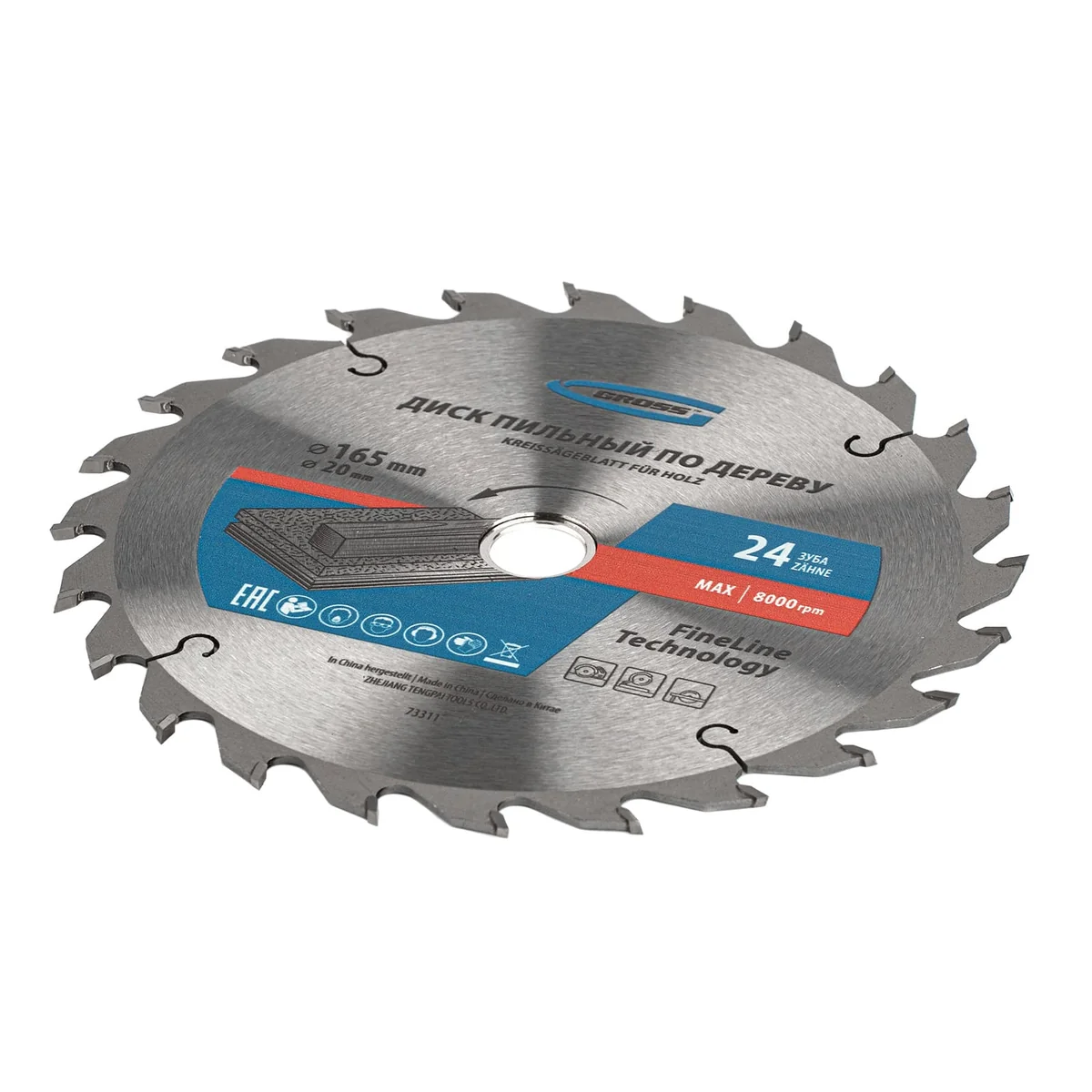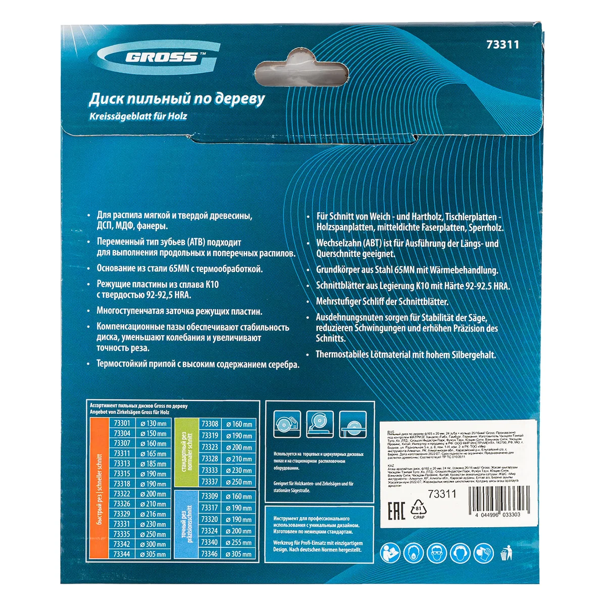 Пильный диск Gross 73311, ф165 х 20 мм, с 24 зубьями и переходным кольцом 20/16 мм, предназначен для распила древесины мягких и твердых пород, ДСП, МДФ и фанеры. Является оснасткой для циркулярных и торцовочных пил с посадочным диаметром 20 мм, благодаря универсальному типу зубьев АТВ подходит как для продольного, так и для поперечного реза материалов. Диск изготовлен на высококачественном оборудовании, специально рассчитан на профессиональное применение и выполнение большого объема работ.ПреимуществаВысокое качество работ — 24 крупных зуба и режущие кромки, прошедшие многоступенчатую автоматическую заточку, обеспечивают быстрый и точный рез материалов.Прочность — корпус изготовлен из инструментальной стали 65Mn и термообработан, поэтому обладает устойчивостью к динамическим нагрузкам.Максимальный рабочий ресурс — режущие пластины выполнены из сплава К10 со специальными добавками Ceratizit твердостью 91 HRА, что гарантирует их износостойкость.Надежность — в припое содержится значительное количество серебра, он прочно фиксирует твердосплавные пластины к корпусу диска.Продуманная конструкция — компенсационные пазы, выполненные при помощи лазера, способствуют существенному уменьшению деформации диска и получению ровного среза.Кольцо-переходник в комплекте — при необходимости можно самостоятельно изменить посадочный диаметр и установить диск на электроинструмент с посадкой 16 мм.
