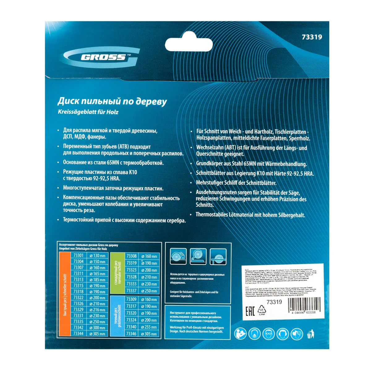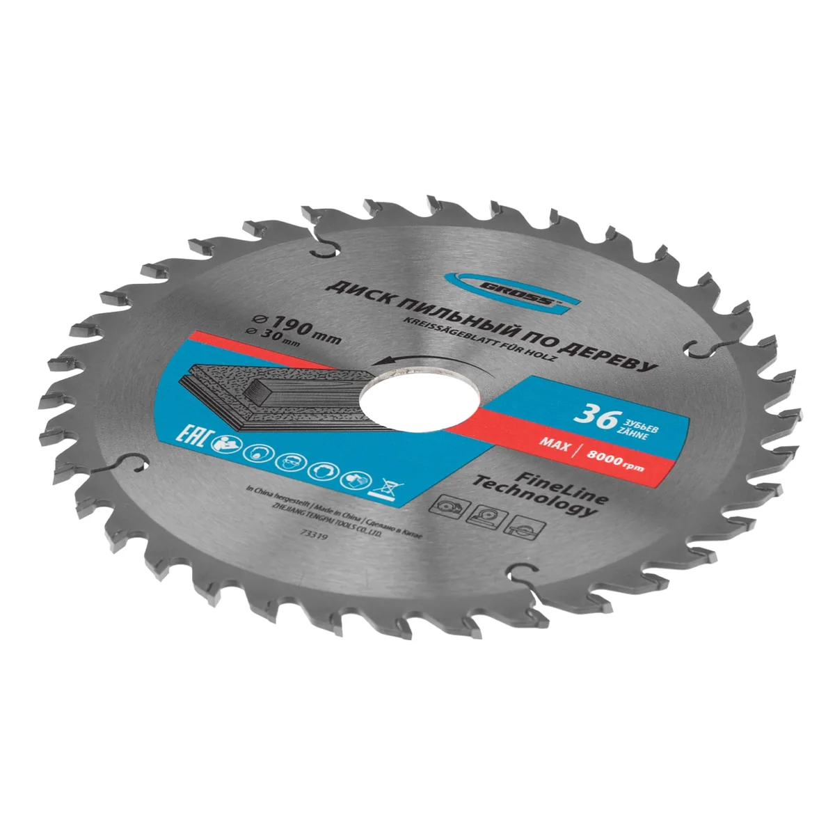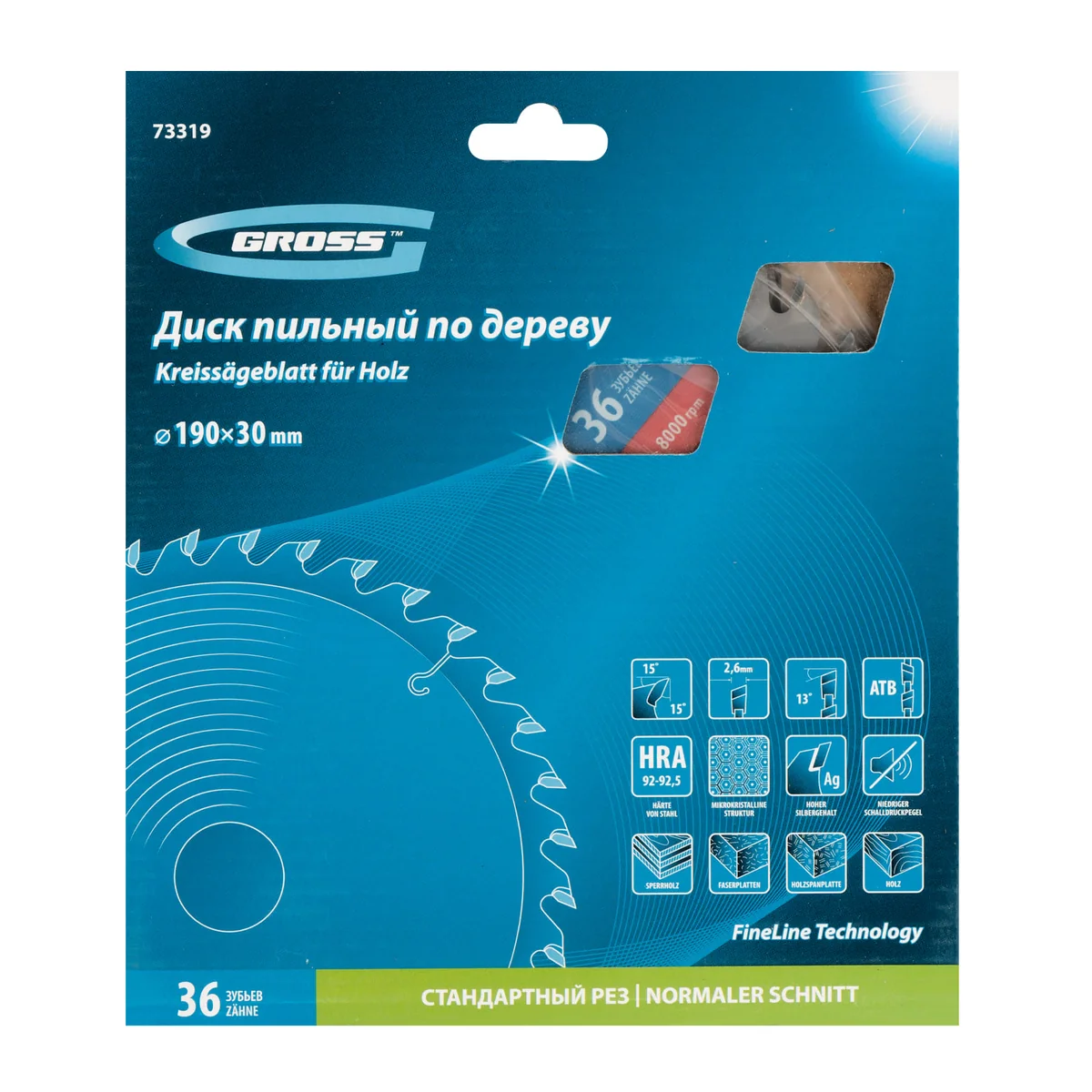 Пильный диск Gross 73319, ф190 х 30 мм, с 36 зубьями, предназначен для распила древесины мягких и твердых пород, ДСП, МДФ и фанеры. Является оснасткой для циркулярных и торцовочных пил с посадочным диаметром 20 мм, благодаря универсальному типу зубьев АТВ подходит как для продольного, так и для поперечного реза материалов. Диск изготовлен на высококачественном оборудовании, специально рассчитан на профессиональное применение и выполнение большого объема работ.ПреимуществаВысокое качество работ — 36 средних зубьев и режущие кромки, прошедшие многоступенчатую автоматическую заточку, обеспечивают оптимальное соотношение скорости и качества реза.Прочность — корпус изготовлен из инструментальной стали 65Mn и термообработан, поэтому обладает устойчивостью к динамическим нагрузкам.Максимальный рабочий ресурс — режущие пластины выполнены из сплава К10 со специальными добавками Ceratizit твердостью 91 HRА, что гарантирует их износостойкость.Надежность — в припое содержится значительное количество серебра, он прочно фиксирует твердосплавные пластины к корпусу диска.Продуманная конструкция — компенсационные пазы, выполненные при помощи лазера, способствуют существенному уменьшению деформации диска и получению ровного среза.