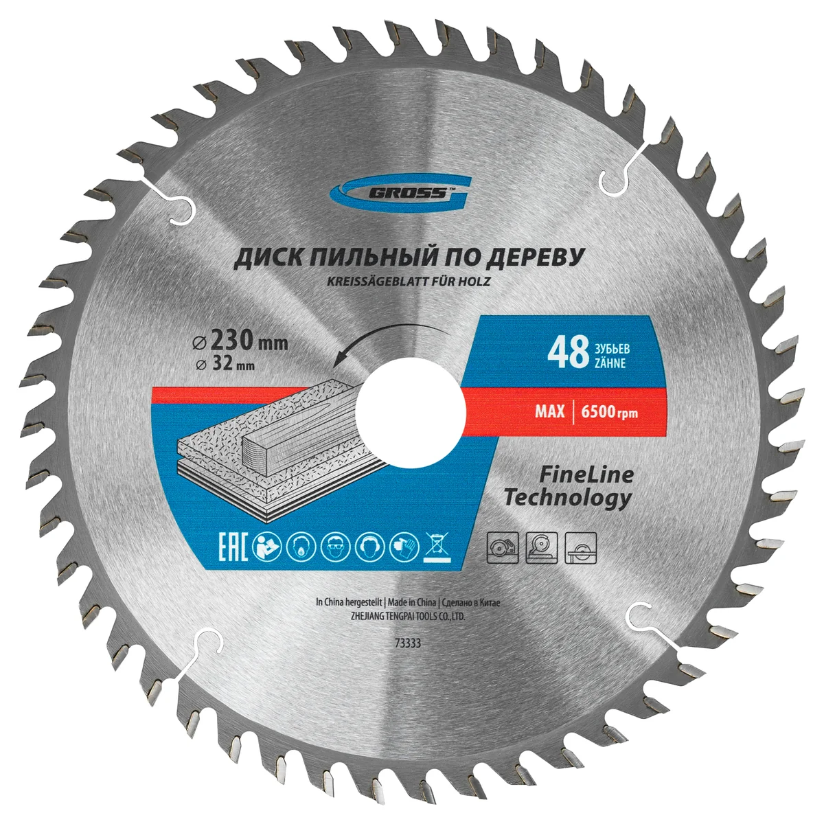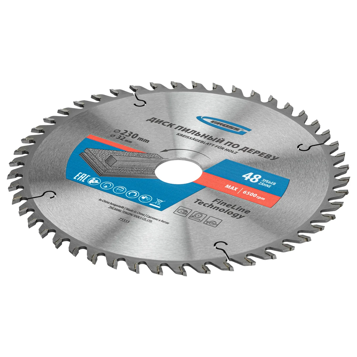 Пильный диск Gross 73333, ф230 х 32 мм, с 48 зубьями и переходным кольцом 32/30 мм предназначен для распила древесины мягких и твердых пород, ДСП, МДФ и фанеры. Является оснасткой для циркулярных и торцовочных пил с посадочным диаметром 32 мм, благодаря универсальному типу зубьев АТВ подходит преимущественно для поперечного реза материалов. Диск изготовлен на высококачественном оборудовании, специально рассчитан на профессиональное применение и выполнение большого объема работ.Преимущества48 мелких зубьев обеспечивают точный и чистый рез материалов.Кольцо-переходник позволяет самостоятельно изменить посадочный диаметр при необходимости и устанавливать диск на электроинструмент с посадкой 30 мм.Режущие пластины изготовлены из сплава К10 со специальными добавками Ceratizit твердостью 91 HRА, что гарантирует их износостойкость и максимальный рабочий ресурс.В припое содержится значительное количество серебра, он надежно фиксирует твердосплавные пластины к корпусу диска.Режущие кромки прошли многоступенчатую автоматическую заточку, обеспечивающую высокое качество пиления.Корпус изготовлен из инструментальной стали 65Mn и термообработан, поэтому обладает устойчивостью к динамическим нагрузкам.Компенсационные пазы, выполненные при помощи лазера, способствуют существенному уменьшению деформации диска и получению ровного среза.