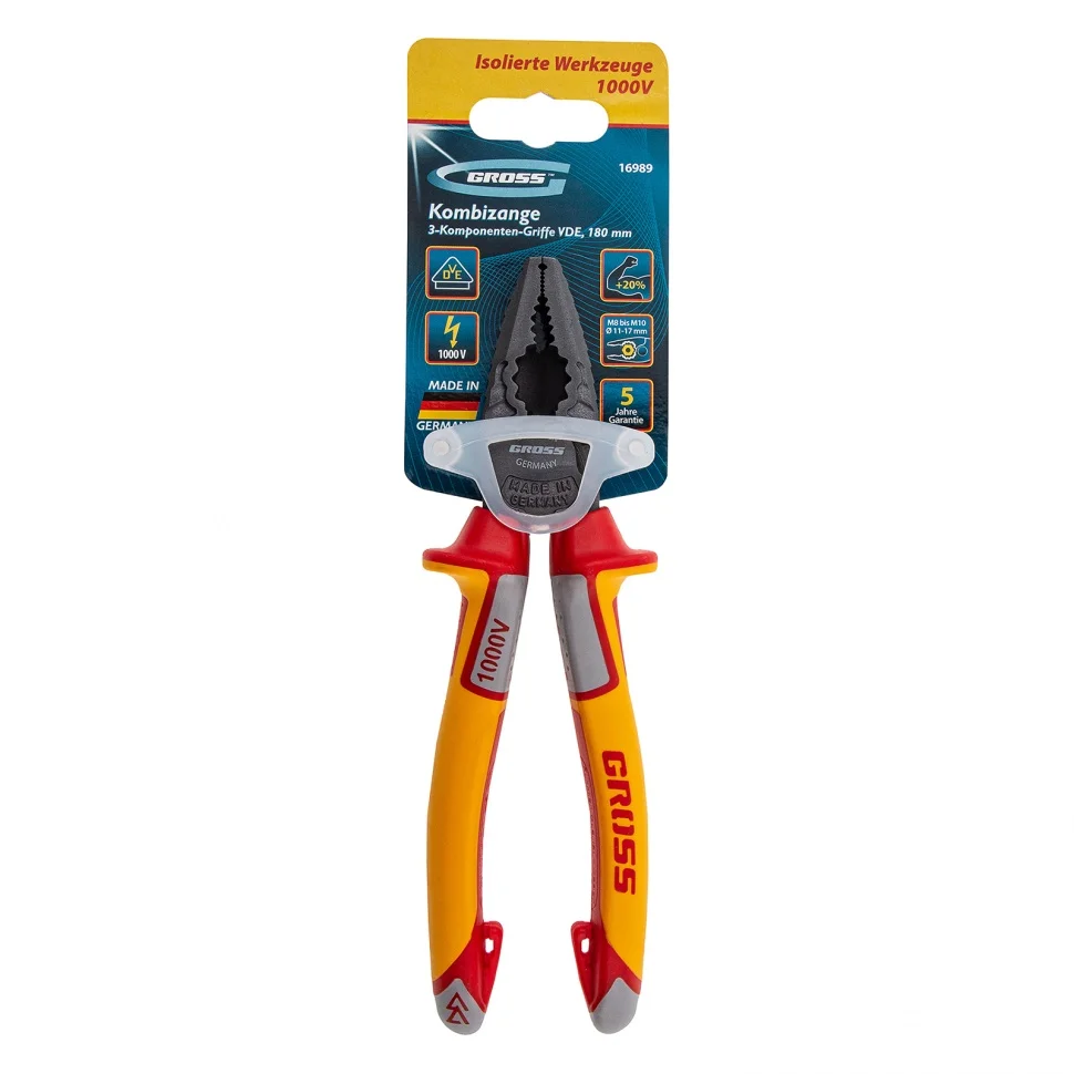 Плоскогубцы комбинированные, диэлектрические трехкомпонентные рукоятки до 1000 В, 180 мм Gross 16989