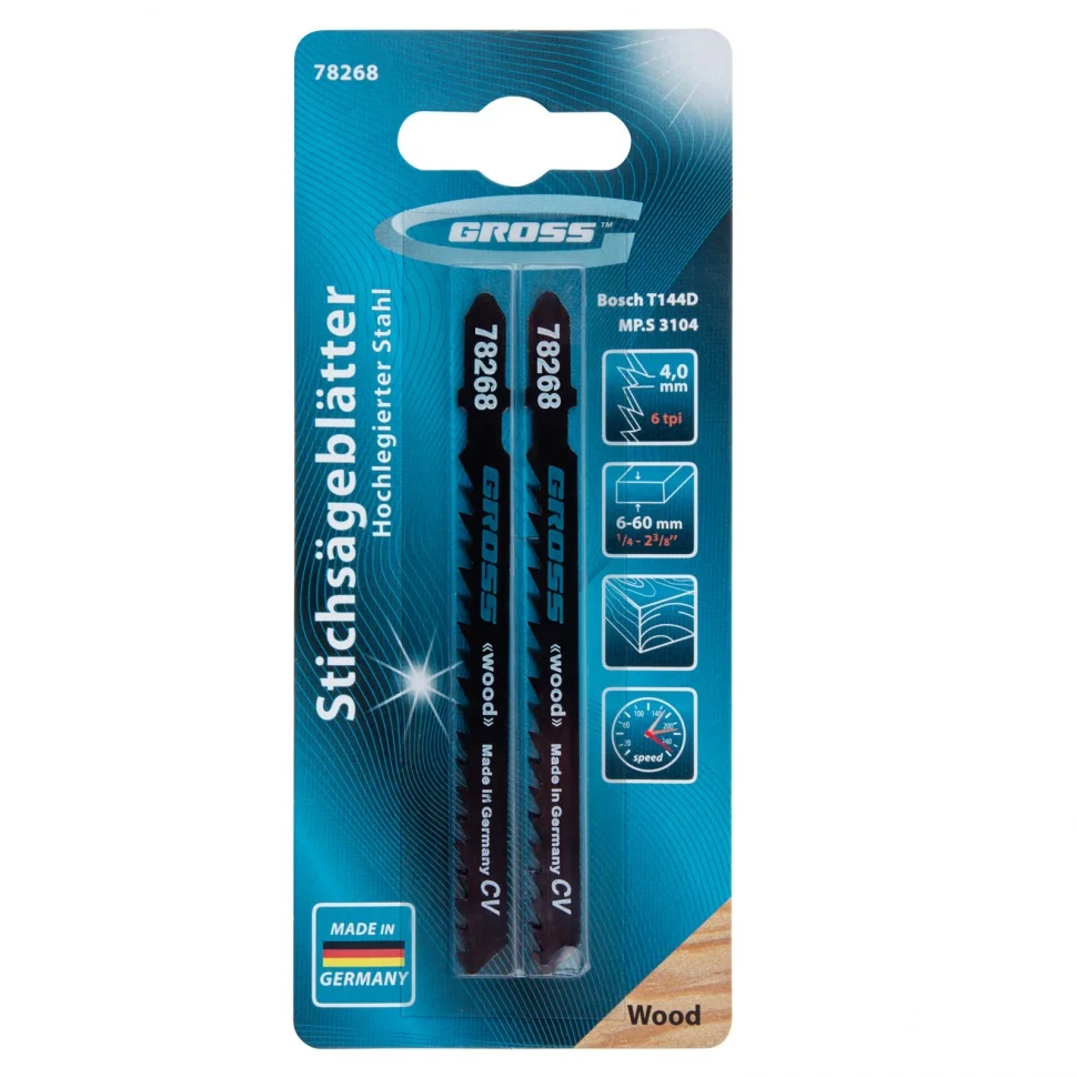 Полотна для электролобзика по дереву Gross 78268, 2 шт. (3104 - T144D), используются для работы с древесиной мягких и твердых пород, ДСП, ДВП и композитных материалов на основе древесины. Они рассчитаны на профессиональное применение, пригодятся при проведении строительных и ремонтных работ. За счет рабочей длины 75 мм и толщины 1,25 мм полотна способны распилить заготовки толщиной 6-60 мм.ПреимуществаДолгий срок службы — полотна из хромованадиевой стали отличаются высокой твердостью и износостойкостью.Высокая точность работ — отшлифованные под конус боковые поверхности полотен и зубья с шагом 4 мм повышают качество реза, оставляя на месте распила ровную кромку.Удобное и безопасное хранение — полотна упакованы в жесткий блистер.