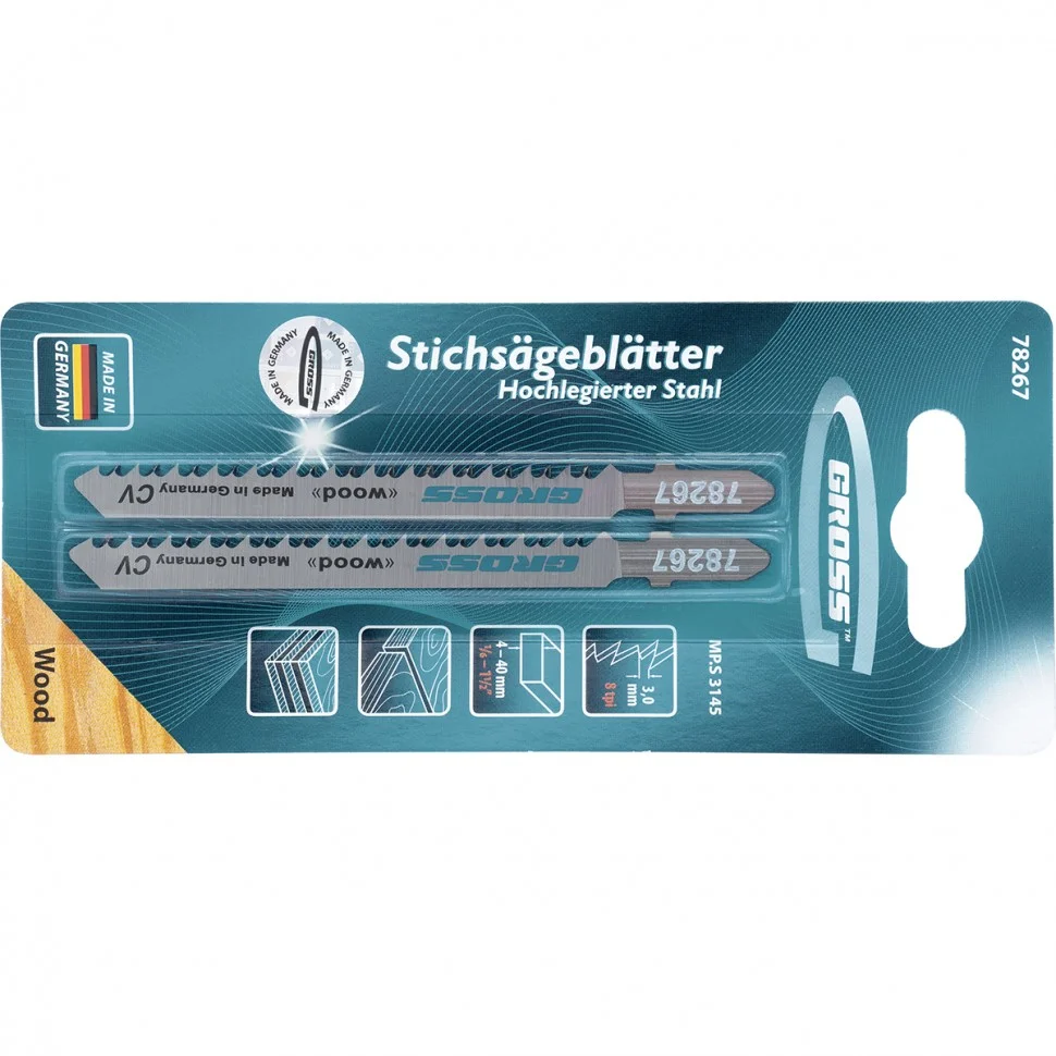 Полотна по дереву Gross 78267, 2 шт. (3145), являются сменными режущими элементами для большинства современных моделей электролобзиков. Осуществляют прямой рез деревянных заготовок и изделий толщиной 4-40 мм. Высококачественные полотна пригодятся профессиональным мастерам в ходе проведения ремонтных и строительных работ.ПреимуществаПолотна произведены в Германии из высококачественной хромованадиевой стали, обладают твердостью и износостойкостью.Точность и аккуратность распиловки обеспечивают зубья с шагом 3 мм.Лазерная раскройка профиля полотен, автоматизированная заточка и шлифовка гарантируют высокое качество реза.Удобство транспортировки и безопасность хранения обеспечивает жесткий блистер, в котором поставляются полотна.