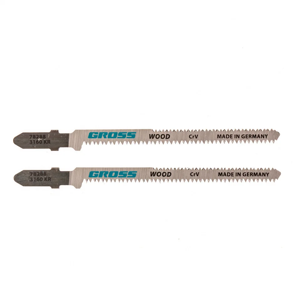 Двухсторонние полотна для электролобзика по дереву Gross 78288, 2 шт. (3160 KR), подходят для прямого и чистого фигурного реза материалов. Могут применяться для обработки древесины, фанеры, ДСП, ДВП, а также пластика толщиной 3-60 мм. Двухсторонний профиль обеспечивает качественный гладкий распил, полотна рассчитаны на профессиональное применение.ПреимуществаИзносостойкость и прочность — полотна выполнены из инструментальной хромованадиевой стали с высоким содержанием углерода.Закалка в вакуумных печах — полотна обладают высокой твердостью, способны выдерживать длительную эксплуатацию без риска перегрева и поломки зубьев.Точность работы — шаг зубьев полотен составляет 2 мм, кромка получается аккуратной и чистой.