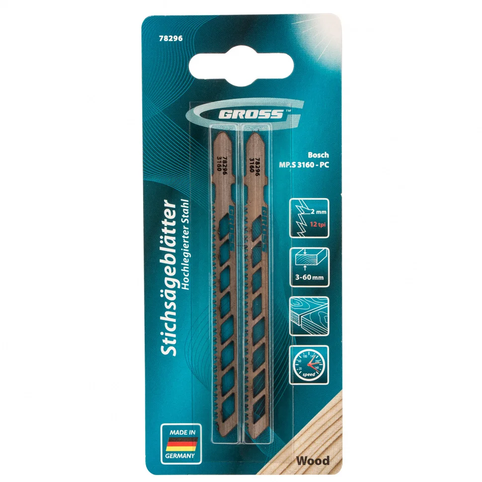 Полотна для электролобзика по дереву Gross 78296, 2 шт. (3160 - PC), служат для улучшенного быстрого и чистого прямого реза заготовок и изделий из древесины, ДСП, ДВП, МДФ, фанеры, пластика. Благодаря длине 75 мм они справляются с распилом материалов толщиной 3-60 мм. Шаг зубьев 2 мм повышает точность распила.ПреимуществаДолговечность и надежность — полотна произведены в Германии из хромованадиевой стали с повышенным содержанием углерода.Высокая твердость и устойчивость к износу — режущие части прошли закалку в вакуумных печах.Технологические отверстия — полотна обеспечивают высокую скорость реза, эффективный отвод шлама и получение аккуратного среза.
