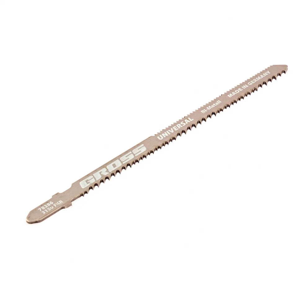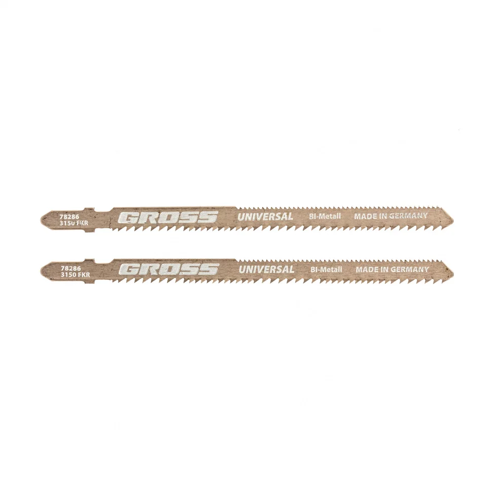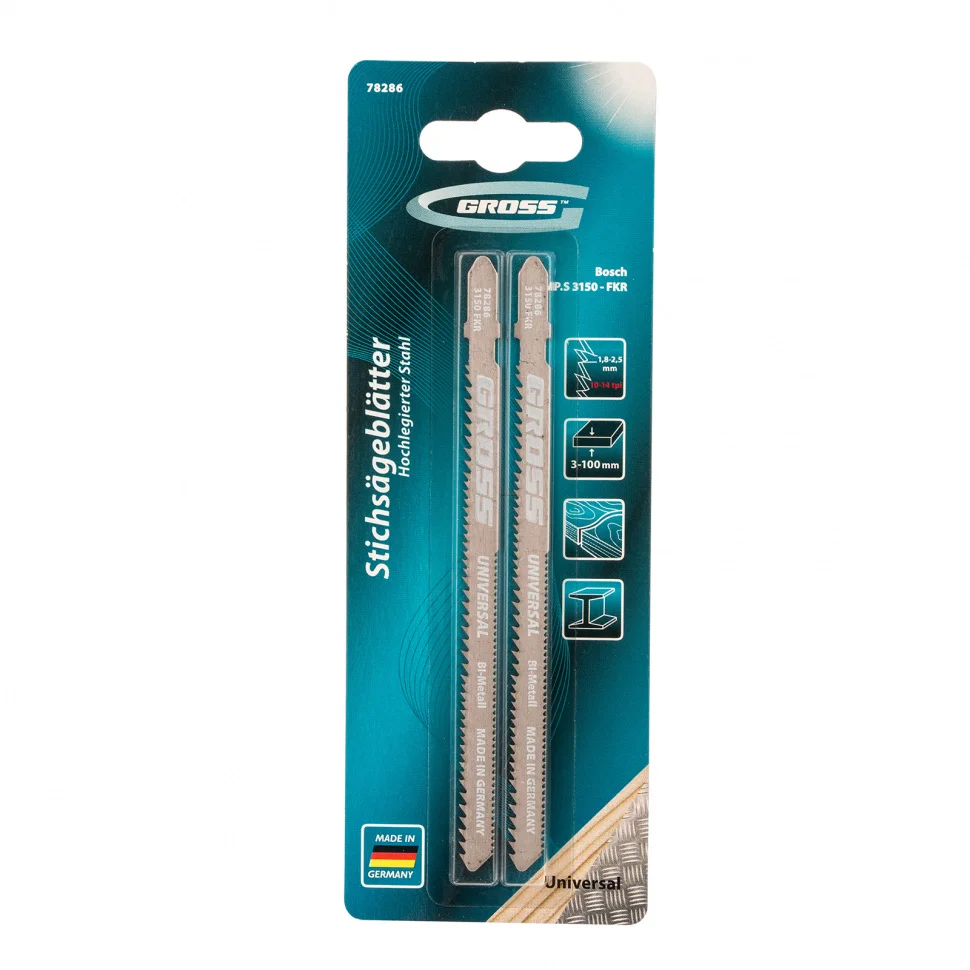 Универсальные двусторонние полотна Gross 78286, 2 шт. (3150 - FKR), предназначены для фигурного и чистого прямого реза под свободным углом. Позволяют работать практически с любым типом материалов: черным и цветным металлом, алюминиевым профилем и трубами толщиной 3-10 мм, оргстекла и пластмассы 3-100 мм, ламината, ДСП, древесины 5-100 мм, в том числе клееной. Полотна изготовлены из качественных материалов на высокотехнологичном производстве в Германии, поэтому рассчитаны на профессиональное использование.ПреимуществаБиметалл придает полотнам высокую гибкость, прочность и устойчивость к механическим нагрузкам, что положительно сказывается на их ресурсе.Твердые износостойкие зубья сохраняют высокую режущую способность при нагреве, поэтому полотна подходят для интенсивного использования.Полотна продаются в жестком блистере, который обеспечивает удобство хранения и безопасность транспортировки.