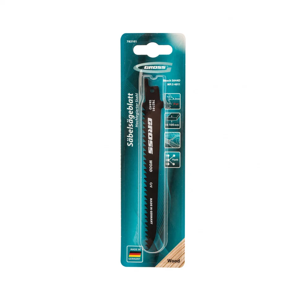 Полотна по дереву Gross 782101, 4011 - S644D, 2 шт. размером 130 x 4,2 мм, используются совместно с сабельной пилой для фигурного и прямого реза. Профессиональные полотна обеспечивают возможность реза древесины любой твердости толщиной до 100 мм. Они пригодятся при проведении ремонтных, строительных, монтажных/ демонтажных работ.ПреимуществаХромованадиевая сталь, из которой изготовлены полотна, придает им необходимую жесткость и высокую устойчивость к износу.Полотна закалены в вакуумных печах, поэтому обладают высокой твердостью и долго сохраняют заточку.Шаг зубьев 4,2 мм обеспечивает отличную режущую способность полотен, что повышает скорость работы.Изделия произведены в Германии с полным соблюдением действующих стандартов, это говорит об их высоком качестве.Двух полотен в комплекте хватит надолго.