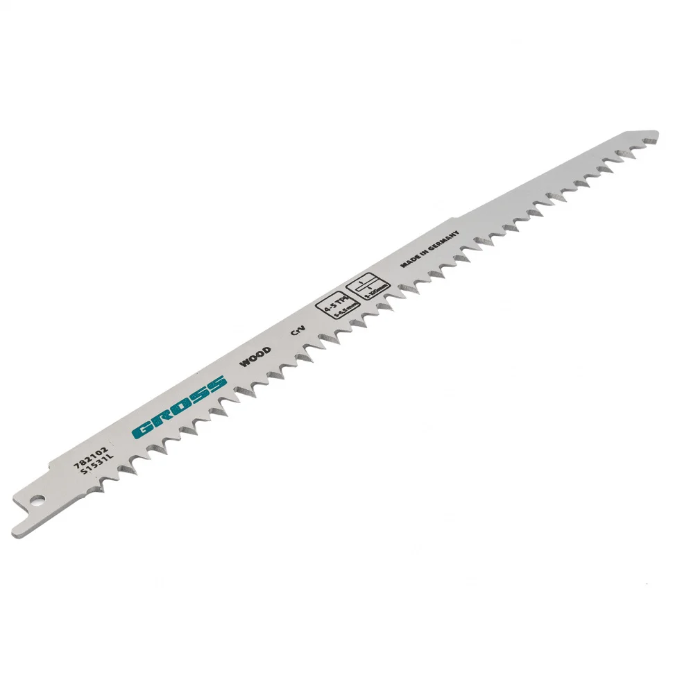 Полотна по дереву Gross 782102, 4052 - S1531L, 2 шт. размером 210 x 5-6,5 мм, используются совместно с сабельной пилой для фигурного и прямого реза. Профессиональные полотна обеспечивают возможность реза древесины и обрезки сучьев любой твердости толщиной до 190 мм. Они пригодятся при проведении ремонтных, строительных, садовых, монтажных/ демонтажных работ.ПреимуществаХромованадиевая сталь, из которой изготовлены полотна, придает им необходимую жесткость и высокую устойчивость к износу.Полотна закалены в вакуумных печах, поэтому обладают высокой твердостью и долго сохраняют заточку.Переменный шаг зубьев 5 и 6-,5 мм обеспечивает отличную режущую способность полотен, что повышает скорость работы.Изделия произведены в Германии с полным соблюдением действующих стандартов, это говорит об их высоком качестве.Двух полотен в комплекте хватит надолго.