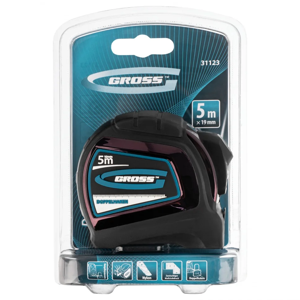 Автоматическая рулетка Gross «Doppelhaken» 31123 с односторонним зацепом, лентой 5 м x 19 мм, двухсторонней шкалой и нейлоновым покрытием, пригодится в хозяйстве и на строительной площадке. С ее помощью можно осуществить замеры стен, полов, различных материалов и конструкций.Преимущества Удобная эксплуатация — автоматический фиксатор предотвращает скручивание ленты и позволяет удержать ее на необходимой длине. Работа в труднодоступных местах — ширина ленты составляет всего 19 мм. Двухсторонняя шкала — можно использовать любую сторону ленты для замеров, что особенно актуально при определении диаметра объекта. Надежность — корпус рулетки из прочного ABS-пластика и термопластичной резины не скользит в руках, устойчив к перепадам температур и механическим воздействиям. Долговечность — измерительное полотно с нейлоновым покрытием надежно защищено от истирания, а возвратная пружина из углеродистой стали обладает высокими показателями упругости.