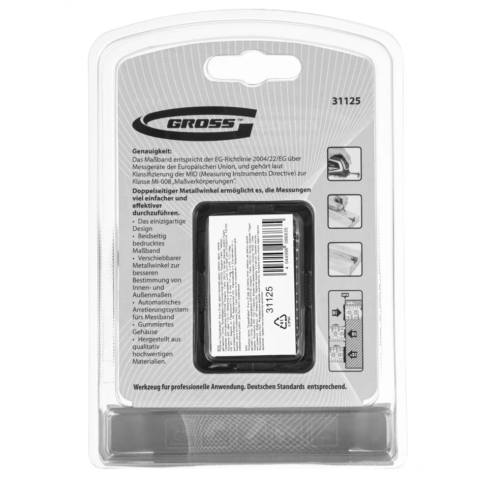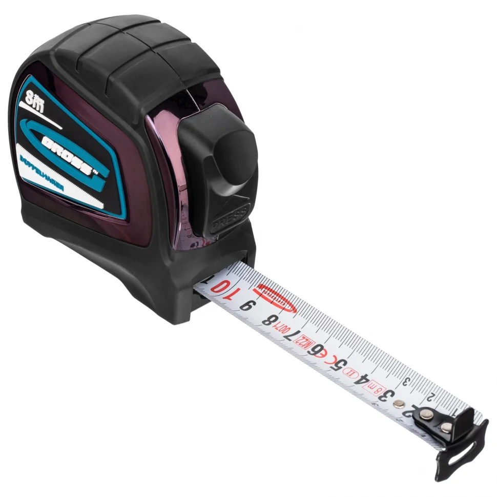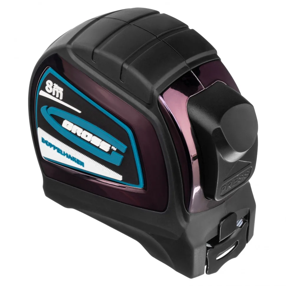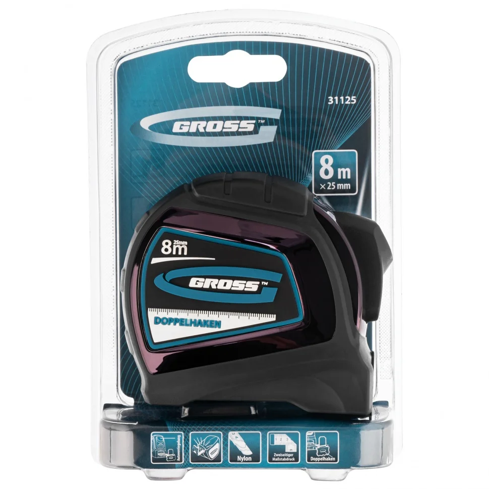 Автоматическая рулетка Gross «Doppelhaken» 31125 с односторонним зацепом, лентой 8 м x 25 мм, двухсторонней шкалой и нейлоновым покрытием, пригодится в хозяйстве и на строительной площадке. С ее помощью можно осуществить замеры стен, полов, различных материалов и конструкций.Преимущества Удобная эксплуатация — автоматический фиксатор предотвращает скручивание ленты и позволяет удержать ее на необходимой длине. Двухсторонняя шкала — можно использовать любую сторону ленты для замеров, что особенно актуально при определении диаметра объекта. Надежность — корпус рулетки из прочного ABS-пластика и термопластичной резины не скользит в руках, устойчив к перепадам температур и механическим воздействиям. Долговечность — измерительное полотно с нейлоновым покрытием надежно защищено от истирания, а возвратная пружина из углеродистой стали обладает высокими показателями упругости.