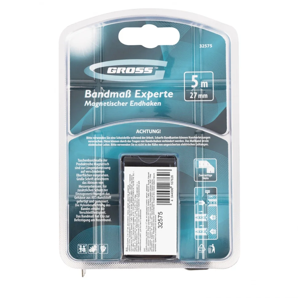 Рулетка Gross «Experte» 32575 с полотном 5 м х 27 мм, в двухкомпонентном корпусе, с двухсторонней разметкой и нейлоновым покрытием ленты, пригодится во время проведения ремонтных и строительных работ. С ее помощью можно измерять заготовки, материалы, конструкции и т.д. Благодаря магнитному зацепу рулетка оптимальна для работы с металлическими поверхностями, а широкое упругое полотно удобно для выполнения измерений в труднодоступных местах.ПреимуществаВысокая точность измерений — за счет подвижного зацепа отметка «0» всегда совпадает с краем измеряемой детали.Долговечность — нейлоновое покрытие увеличивает износостойкость ленты.Удобная эксплуатация — двойной зацеп и двухсторонняя шкала упрощают работу.Прочность и эргономичность — двухкомпонентный корпус с обрезиненным покрытием устойчив к ударному воздействию, а также удобно лежит в руке и не выскальзывает из ладони.
