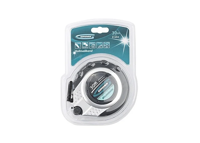 Геодезическая рулетка Gross Rollmassband 31252, 30 м х 13 мм, в закрытом корпусе, с металлической лентой с нейлоновым покрытием, используется для определения расстояний и размеров различных объектов. Механизм заключен в двухкомпонентный закрытый корпус из пластика и термостойкой резины, поэтому рулетка устойчива к повреждениям в результате ударов и падений. Комбинированный зацеп упрощает фиксацию измерительной ленты на измеряемой поверхности. Инструмент будет полезен на строительной площадке или земельном участке, а также при проведении обмеров внутри помещений.ПреимуществаИзмерительное полотно выполнено из металла, поэтому не растянется со временем.Лента защищена нейлоновым покрытием, поэтому устойчива к истиранию и служит в 6 раз дольше, чем окрашенные полотна.В корпус вмонтирована удобная ручка, позволяющая быстро смотать измерительную ленту.Возвратный механизм имеет передаточный коэффициент 3:1, что в 3 раза повышает эффективность данной модели по сравнению с рулетками, оснащенными обычным механизмом.