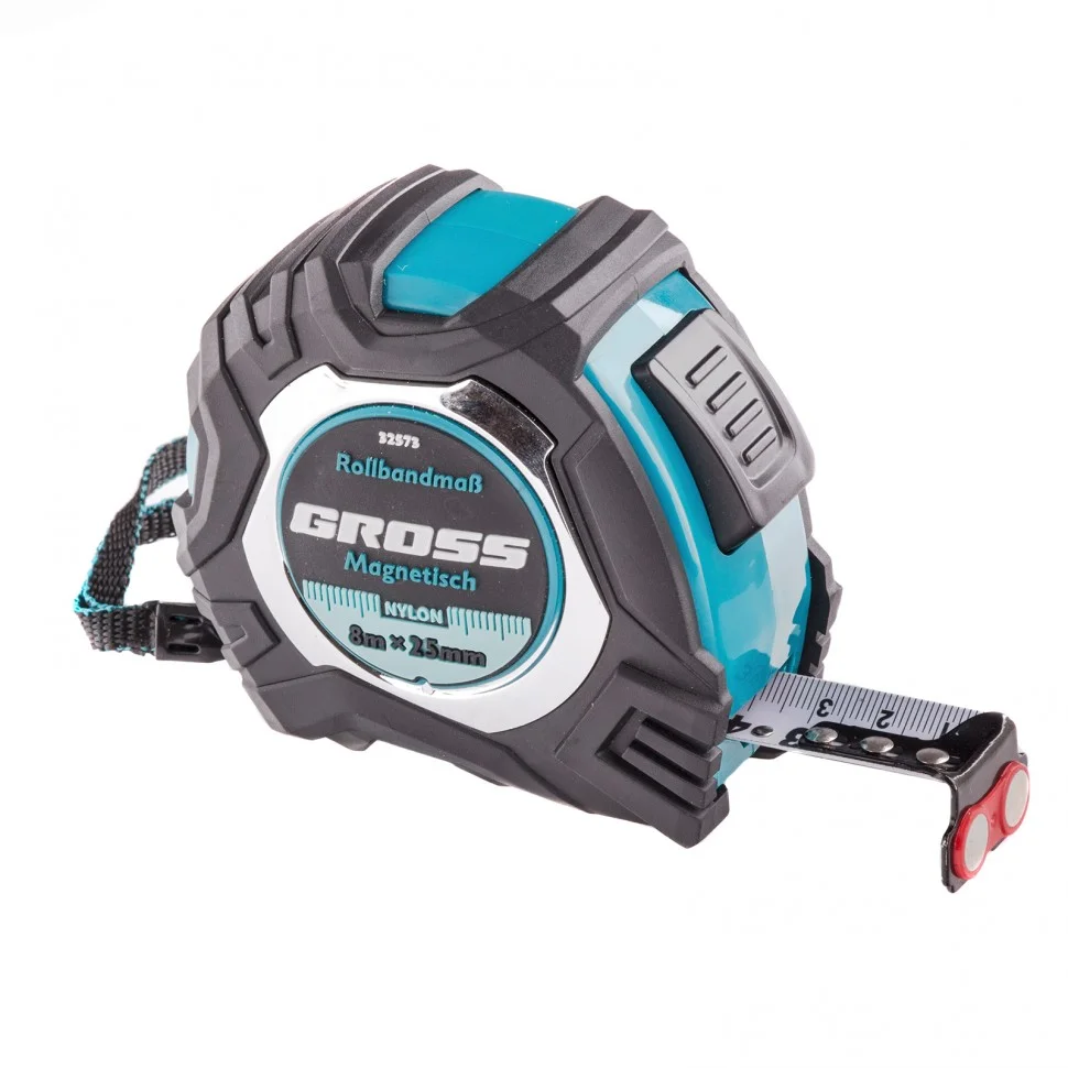 Рулетка «Magnetisch» Gross 32573 в обрезиненном корпусе, с полотном 8 м х 25 мм, магнитным зацепом, нейлоновым покрытием и функцией автоматической фиксации, используется в ходе ремонтных и строительных работ. Оптимально подходит для замера длины стен, полов, различных заготовок, мебели, оконных проемов и т.д. Благодаря магнитному зацепу рулетку удобно использовать при работе с металлическими поверхностями.ПреимуществаКорпус с обрезиненным покрытием защищен от случайных падений с небольшой высоты.Нейлоновое покрытие придает полотну устойчивость к истиранию, что повышает его ресурс в несколько раз.Функция автостопа обеспечивает удобство работы, т.к. лента скручивается только при нажатии кнопки.За счет подвижного зацепа компенсируется погрешность измерений из-за его толщины, что повышает точность работы.Шкала с крупным шрифтом хорошо видна даже на расстоянии.С рулеткой удобно работать благодаря ремешку и зацепу для фиксации на запястье и поясе, соответственно.
