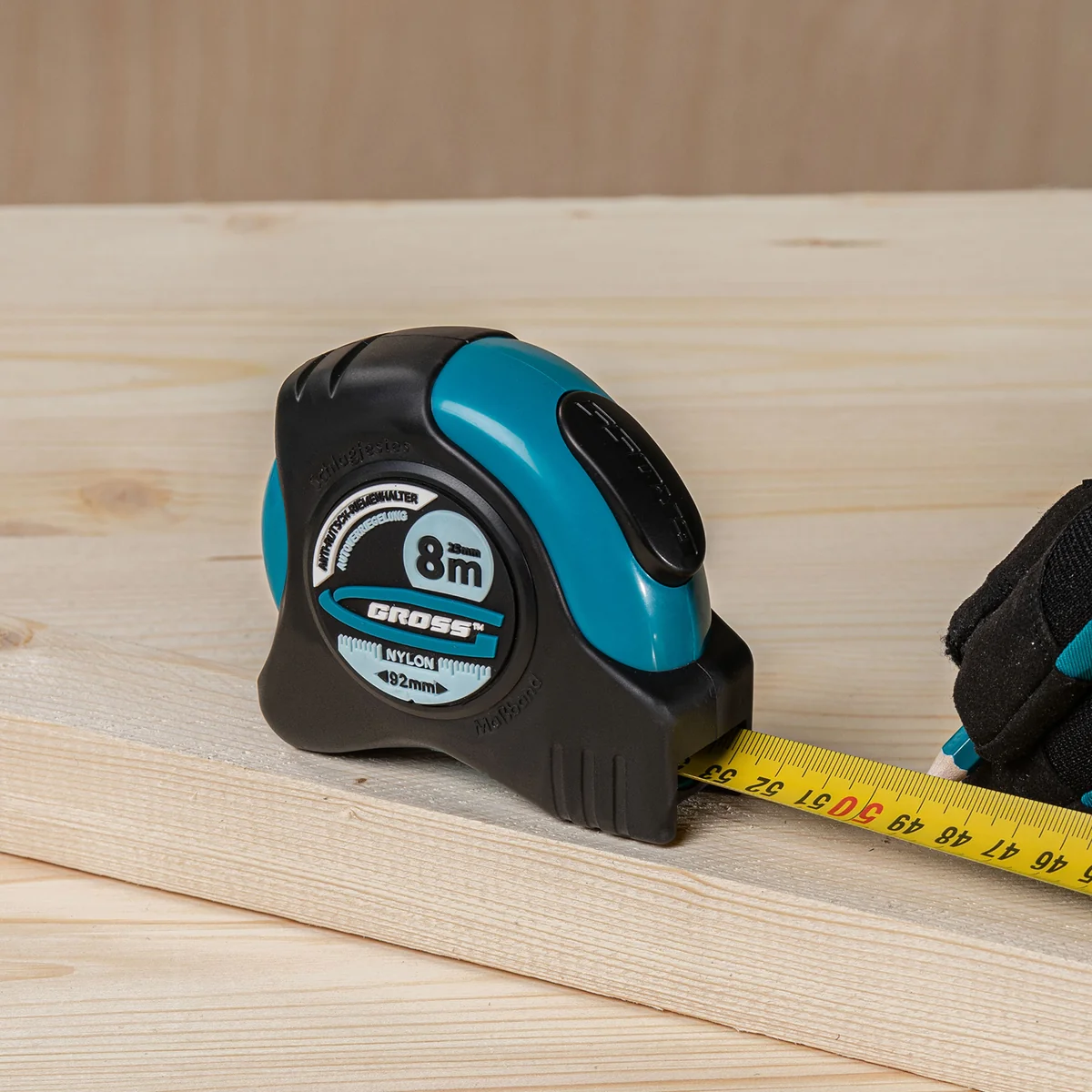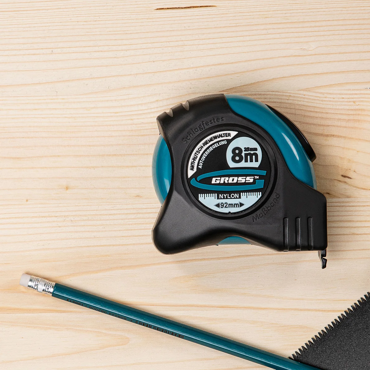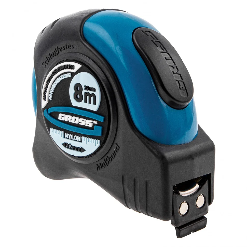 Рулетка Gross «Schlagfest» 31114 с магнитным обрезиненным зацепом, двухсторонней шкалой и функцией автоматической фиксации полотна, 8 м х 25 мм, позволяет определять размеры материалов, вычислять площадь помещения и проводить другие измерительные работы Карманная рулетка — незаменимый инструмент в хозяйстве и на строительной площадке. Магнитный обрезиненный зацеп обеспечивает возможность захвата скользких и металлических поверхностей со сложной формой.ПреимуществаУдобство работы — измерительная шкала нанесена на ленту с обеих сторон.Автоматический фиксатор и дополнительная кнопка паузы — ленту легко удерживать на нужной длине.Высокая точность замеров от нуля — рулетка оснащена подвижным зацепом.Двухкомпонентный корпус — рулетка из ударопрочного ABS-пластика с обрезиненным покрытием выдерживает падения с небольшой высоты и не проскальзывает в руках.Защита полотна от истирания — на стальной ленте имеется нейлоновое покрытие.