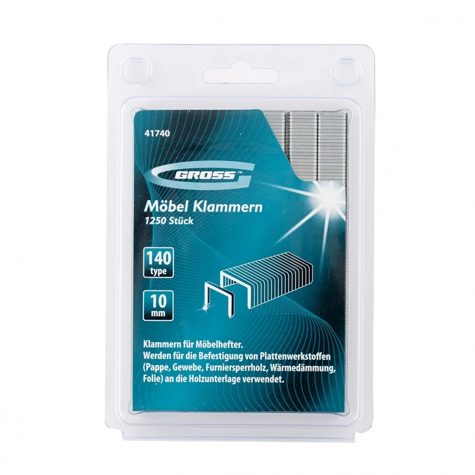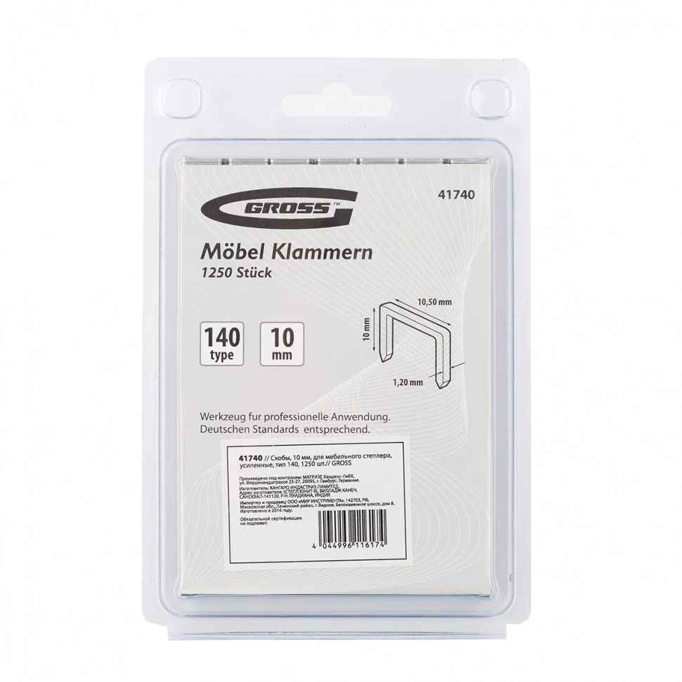Усиленные скобы Gross 41740 10 х 10,5 х 1,2 мм, тип 140, 1250 шт., предназначены для скрепления листовых материалов с помощью мебельного степлера. Ими можно зафиксировать картон, фанеру, ткань в ходе проведения облицовочных или ремонтных работ.ПреимуществаСкобы, выполненные из стали, обладают высокими прочностными характеристиками, поэтому их можно вбивать в древесину твердых пород.Изделия оцинкованы для надежной защиты от коррозии.Расходники поставляются в блистере с замками для удобства хранения и транспортировки.1250 скоб в упаковке достаточно для бытового и профессионального применения.