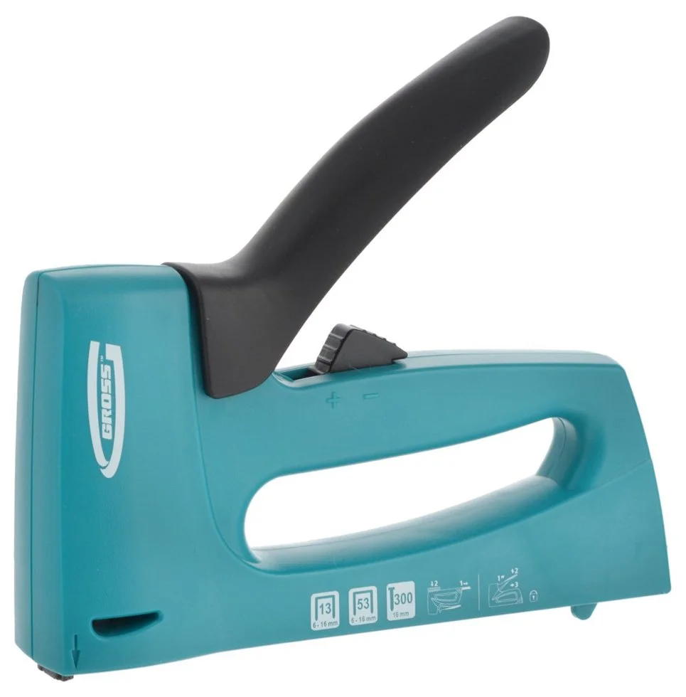 теплер механический Gross 41003 с пластиковым корпусом может работать как с гвоздями типа 300, так и со скобами типов 13 и 53 в качестве расходников. Расположенный на корпусе этого инструмента для мебельных работ ползунок регулирует силу удара, позволяя выбрать оптимальные значения для каждого типа используемого расходника. Степлер поддерживает работу с гвоздями длиной 16 мм и скобами размером от 6 до 16 мм.