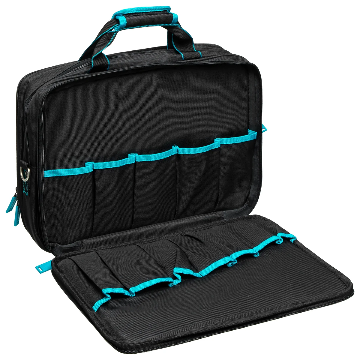 Сумка Gross Meister 90271, 400 х 170 х 300 мм, 31 карман, с отсеком для ноутбука и наплечным ремнем, удобна для переноски и хранения ручных инструментов. Подойдет мастерам по ремонту техники, слесарям, электрикам. Сумку можно брать в офис — в ней помещается ноутбук диагональю до 15 дюймов и бумаги формата А4. В сумке 31 карман и удобные фиксирующие резинки, поэтому каждый инструмент в ней всегда на своем месте.ПреимуществаУниверсальность — сумку можно возить в машине, а также брать с собой в путешествие, т.к. она легко крепится на ручку чемодана.Комфортное использование — сумку удобно носить благодаря ручкам и регулируемому наплечному ремню с расширяющей накладкой.Долговечность — сумка изготовлена из прочного износостойкого материала, устойчивого к истиранию.