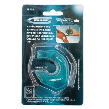 Ладонный труборез Gross «PIRANHA» 78705 с автоматической регулировкой зажима, трещоточным храповым механизмом ,используется для резки труб диаметром ,16 мм (1/2 дюйма). Пригодится частным мастерам и профессионалам при работе с трубами из меди и других цветных металлов.Преимущества Технологическое отверстие в корпусе трубореза под вороток-удлинитель позволяет работать в труднодоступных местах. Встроенная автоматическая регулировка зажима трубы и храповый механизм значительно повышают производительность работы. Режущая часть из японской стали SUJ2 твердостью 56-58 HRC обеспечивает точный и аккуратный рез. Ударопрочный пластиковый корпус выступает залогом качества и долговечности инструмента. Благодаря роликовой конструкции режущий элемент быстро снимается и устанавливается.