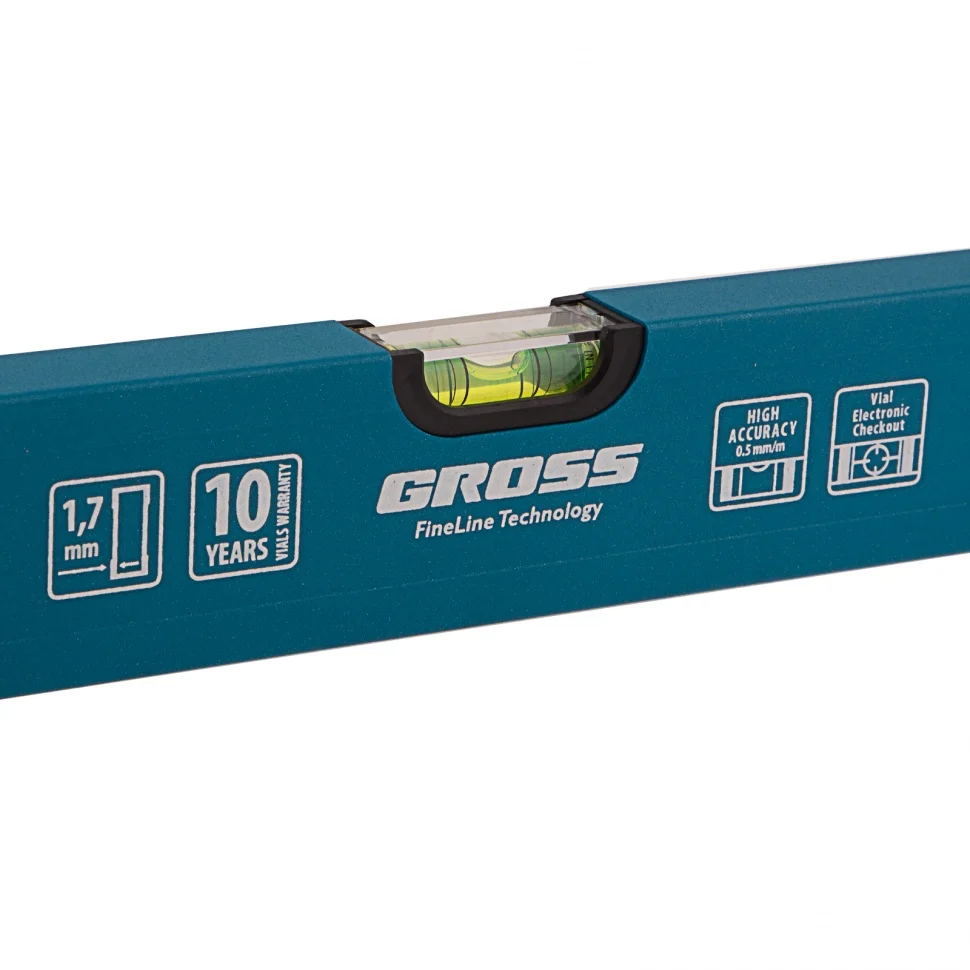 Усиленный алюминиевый уровень Gross 33630 длиной 1000 мм, с 3 глазками, поможет найти отклонения от горизонтали и вертикали для повышения точности работы. Этот простой, но незаменимый для любого мастера инструмент пригодится на стройке, при проведении ремонтных и монтажных работ. Уровень с глазком на 45 градусов позволяет измерить угол наклона, поэтому также пригодится при кровельных работах, проверке откосов и различных наклонных поверхностей.ПреимуществаПротивоударная конструкция — колбы из полистирола обладают высокой стойкостью к механическим воздействиям, поэтому инструмент выдерживает падения с небольшой высоты.Защитное порошковое покрытие — инструмент устойчив к воздействию агрессивных сред.Качественное исполнение — уровень изготовлен в Италии на высокотехнологичном производстве, погрешность измерений составляет всего 0,5 мм/м.Для определения отклонения вертикали 90 градусов необходимо использовать пузырьковую ампулу только в верхнем положении уровня. Только базовая поверхность является рабочей (противоположная ампуле 180 градусов).