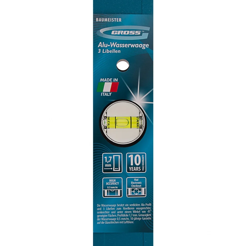 Усиленный алюминиевый уровень Gross 33628 длиной 800 мм, с 3 глазками, поможет найти отклонения от горизонтали и вертикали для повышения точности работы. Этот простой, но незаменимый для любого мастера инструмент пригодится на стройке, при проведении ремонтных и монтажных работ. Уровень с глазком на 45 градусов позволяет измерить угол наклона, поэтому также пригодится при кровельных работах, проверке откосов и различных наклонных поверхностей.ПреимуществаПротивоударная конструкция — колбы из полистирола обладают высокой стойкостью к механическим воздействиям, поэтому инструмент выдерживает падения с небольшой высоты.Защитное порошковое покрытие — инструмент устойчив к воздействию агрессивных сред.Качественное исполнение — уровень изготовлен в Италии на высокотехнологичном производстве, погрешность измерений составляет всего 0,5 мм/м.Для определения отклонения вертикали 90 градусов необходимо использовать пузырьковую ампулу только в верхнем положении уровня. Только базовая поверхность является рабочей (противоположная ампуле 180 градусов).