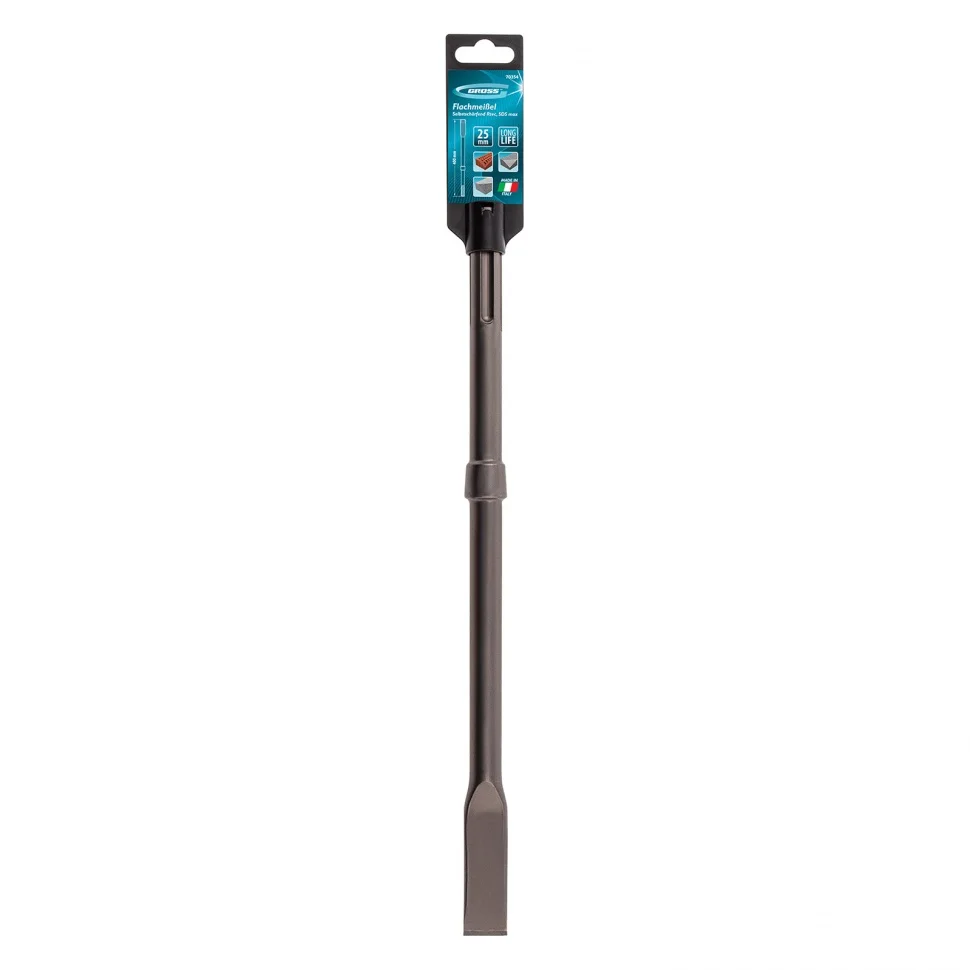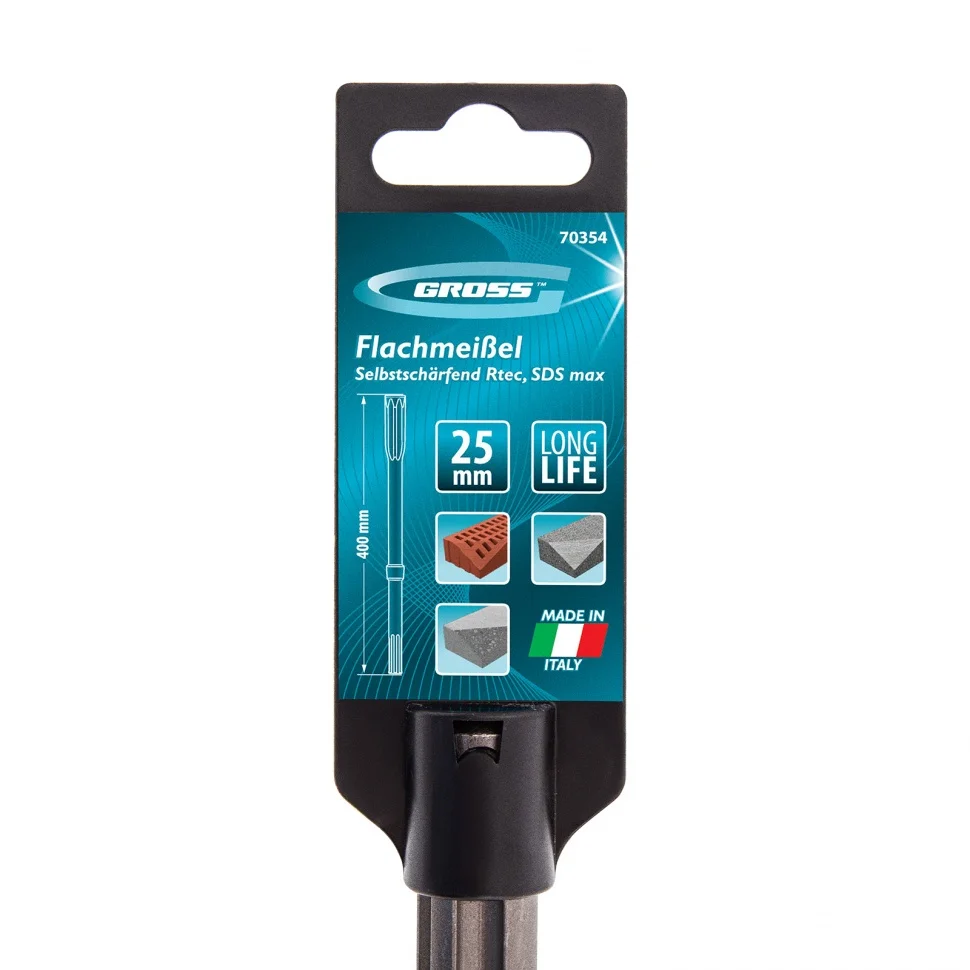 Плоское самозатачивающееся зубило Gross Rtec 70354 длиной 400 м является сменной оснасткой для перфораторов SDS MAX. Оно помогает удалять старые отделочные покрытия, раскалывать бетон и кирпич. Такой инструмент станет полезным помощником для частных и профессиональных мастеров при проведении ремонта и строительных работ.ПреимуществаПрочность и высокий ресурс — зубило выполнено из легированной стали с высоким содержанием углерода.Твердость режущей кромки 54-56 HRC — зубило долго держит заточку.Самозатачивающееся полотно — пользователю не нужно тратить много времени на обслуживание оснастки.Современная конструкция — зубило не заклинивает в патроне перфоратора, оно быстро справляется с разрушением материалов.Эффективный отвод шлама — на рабочей части предусмотрены специальные углубления.