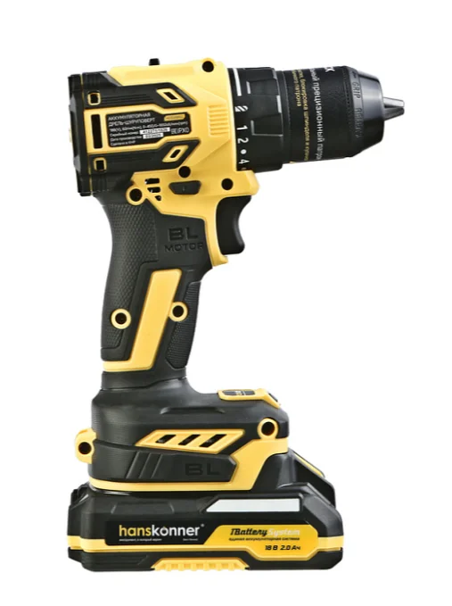 HCD2065C аккумуляторный 18 В, двухскоростной шуруповерт – является частью системы 1BatterySystem, обеспечивающей совместимость одного и того же аккумулятора с целым рядом наименований инструмента. Модель обладает максимально сбалансированной компоновкой: небольшая толщина корпуса и рукояти позволяют эффективное использование в условиях с затрудненным доступом, а нейтральный центр тяжести, и обилие прорезиненных противоскользящих поверхностей способствуют надежному хвату, и лучшему контролю в процессе работы. Шуруповерт оснащен 18 В бесщеточным двигателем, характеризующимся на 30% лучшей производительностью в сравнении с коллекторными аналогами. Кроме того, бесщеточный двигатель отлично справляется с кратковременными перегрузками и не склонен к перегреву. Благодаря применению мощного планетарного механизма High Torque Technology, Hanskonner HCD2065С обладает высоким показателем максимального крутящего момента, достигающего 60 Н м. Имеет две скорости: режим пониженных оборотов (0 – 450 об/мин) предназначен для работ с крепежом, режим повышенных оборотов (0 – 1650 об/мин) – для сверления отверстий в различных материалах. Наличие 20-ти ступенчатой муфты регулировки усилия позволяет производить максимально гибкую настройку необходимого момента затяжки. Предусмотрена функция блокировки вала, способствующая удобству смены оснастки одной рукой. К особенностям Hanskonner HCD2065C стоит отнести электронный тормоз выбега двигателя, гарантирующий мгновенную остановку патрона, эффективную LED-подсветку рабочей зоны WorkingLight с блоком коллиматорных линз, создающих направленный симметричный луч, а также индикатор остаточного заряда аккумулятора PowerCheck. Дополнительному комфорту использования способствуют специальная зацепная скоба крепления на пояс и страховочный ремешок на руку. Шуруповерт штатно комплектуется парой литий-ионных (Li-ion) аккумуляторов емкостью 2.0 А ч с возможностью подзарядки от них через USB выход сторонних гаджетов, импульсным зарядным устройством с функцией быстрой зарядки (0 – 100% – 50 мин), USB LED-фонарем, запитываемым от АКБ, двухсторонней битой.