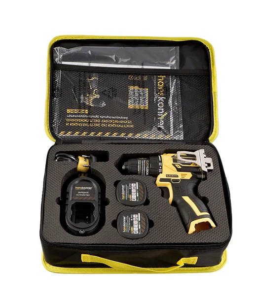 Шуруповерт Hanskonner HCD1645BLC поставляется с двумя сменными аккумуляторами 2.0 Ач и зарядным устройством в сумке-кейсе.