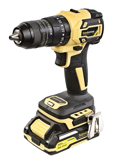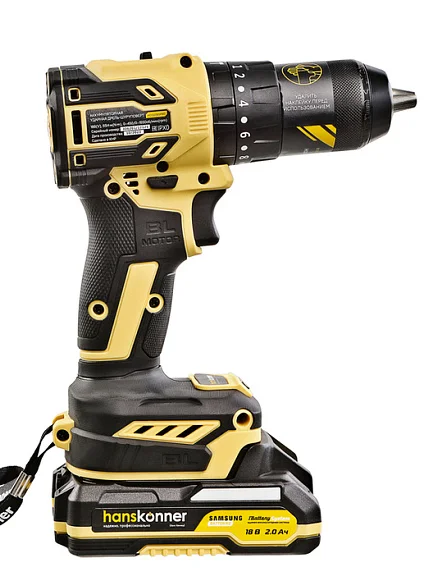 Hanskonner HCD2065PRO – аккумуляторный 18 В, ударный, двухскоростной шуруповерт – является частью системы 1BatterySystem, обеспечивающей совместимость одного и того же аккумулятора с целым рядом наименований инструмента. Модель обладает максимально сбалансированной компоновкой: небольшие размеры корпуса и рукояти позволяют эффективное использование инструмента в условиях с затрудненным доступом, а нейтральный центр тяжести, и обилие прорезиненных противоскользящих поверхностей способствуют надежному хвату, и лучшему контролю в процессе работы. Шуруповерт оснащен 18 В бесщеточным двигателем, характеризующимся на 30% лучшей производительностью в сравнении с коллекторными аналогами. Кроме того, бесщеточный двигатель отлично справляется с кратковременными перегрузками и не склонен к перегреву. Благодаря применению мощного планетарного механизма High Torque Technology, Hanskonner HCD2065PRO обладает высоким показателем максимального крутящего момента, достигающего 65 Н м. Имеет две скорости: режим пониженных оборотов (0 – 450 об/мин) предназначен для работ с крепежом, режим повышенных оборотов (0 – 1650 об/мин) – для сверления отверстий в различных материалах. Важная отличительная черта Hanskonner HCD2065PRO – наличие ударного механизма, что существенно повышает производительность работы при сверлении отверстий в кирпичной кладке, штукатурке, керамике, легком бетоне и неплотном камне. Усиленный цельнометаллический патрон c муфтой ClickLock и максимальным диаметром захвата 13 мм обеспечивает надежность фиксации, и расширяет набор применяемой оснастки для выполнения работ с повышенной нагрузкой. Предусмотрена функция блокировки вала, способствующая удобству смены оснастки одной рукой. К особенностям Hanskonner HCD2065PRO стоит отнести электронный тормоз выбега двигателя, гарантирующий мгновенную остановку патрона, эффективную LED-подсветку рабочей зоны WorkingLight с блоком коллиматорных линз, создающих направленный симметричный луч, а также индикатор остаточного заряда аккумулятора PowerCheck. Дополнительному комфорту использования способствуют специальная зацепная скоба крепления на пояс и страховочный ремешок на руку. Шуруповерт штатно комплектуется парой литий-ионных (Li-ion) аккумуляторов SAMSUNG емкостью 2.0 А ч и 4.0 А ч, с возможностью подзарядки от них через USB выход сторонних гаджетов, импульсным зарядным устройством с функцией быстрой зарядки (время зарядки АКБ 2.0 А ч– 50 мин, АКБ 4.0 А ч – 100 мин), USB LED-фонарем, запитываемым от АКБ, двухсторонней битой. Прочный кейс единой системы хранения инструмента HANSTORAGE гарантирует сохранность устройства и аксессуаров в процессе транспортировки.